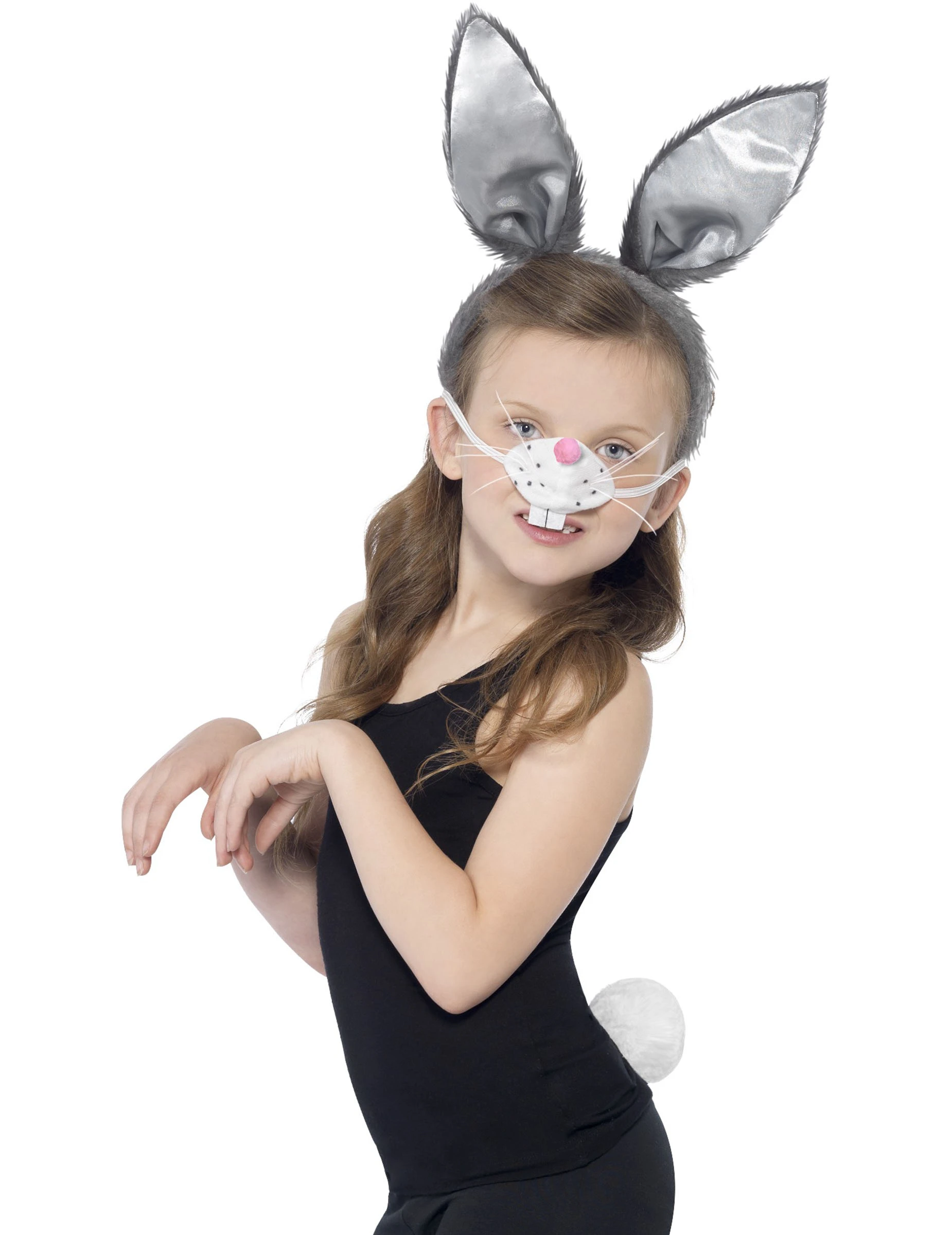 Deze konijnen set voor kinderen bevat een haarband, een neus en een staart. De haarband met pluche effect is grijs. De binnenkant van de konijn oren heeft een satijn effect.