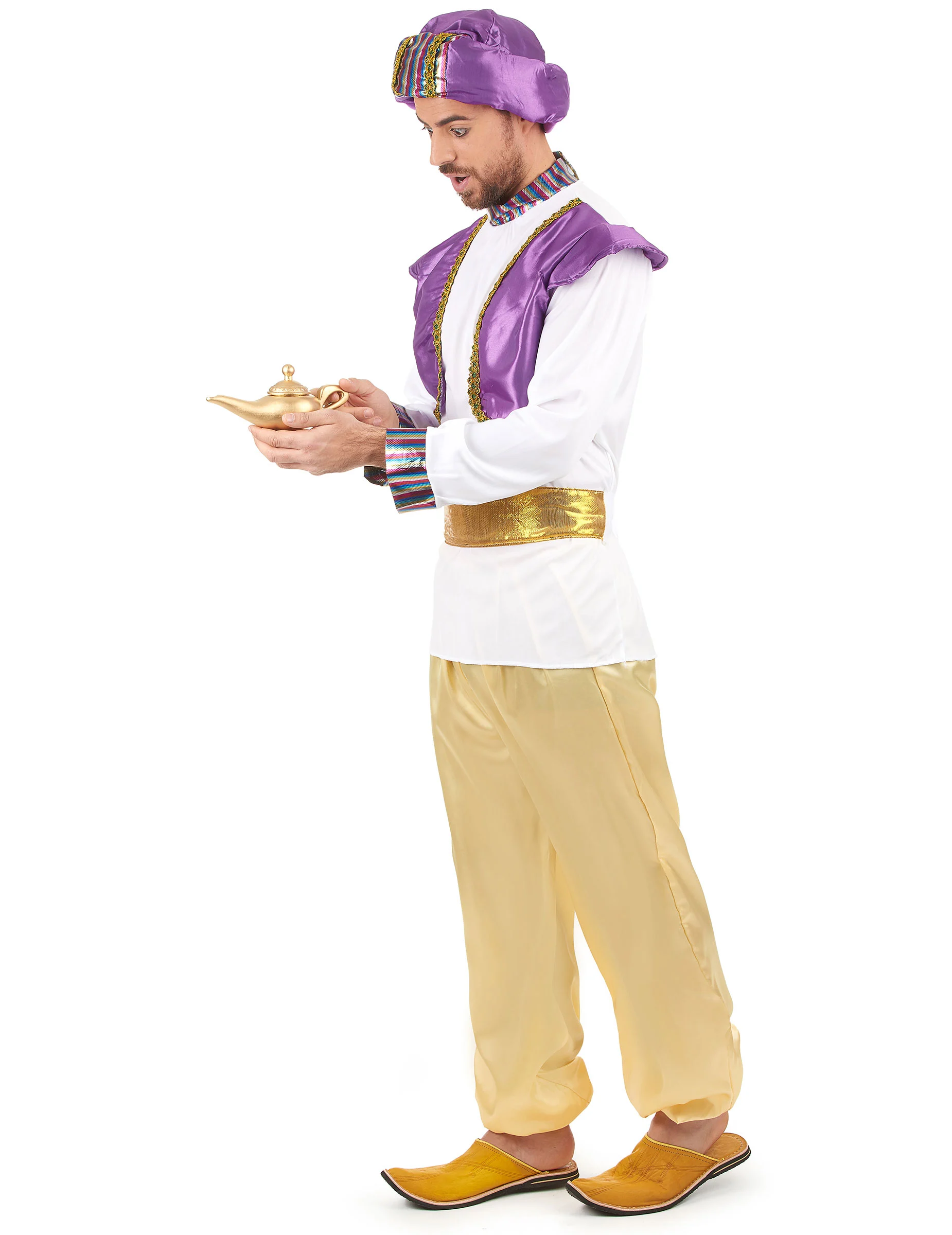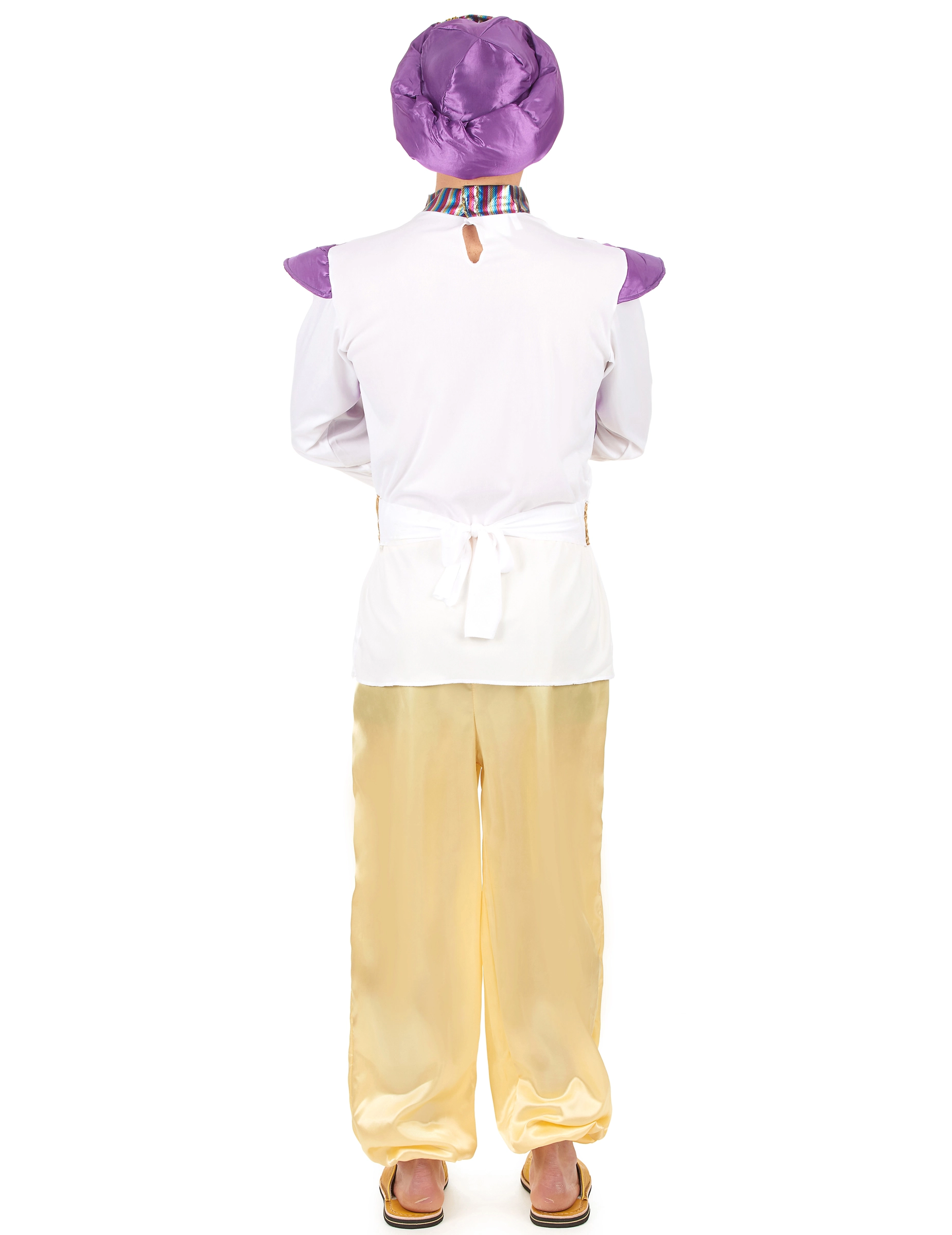 Dit sultankostuum voor mannen bestaat uit een T-shirt, een broek, een riem en een hoed (accessoire niet inbegrepen). Het bovenstuk is wit en paars. De kraag en de uiteinden van de mouwen zijn glanzend. Een paars vest werd ook aan het T-shirt genaaid. De gele broek is satijnachtig. De broek is erg elastisch en past zich perfect aan uw lichaamsvormen aan. Een goudkleurige riem en een sultanshoed in mousse maken de outfit compleet. Dit kostuum is ideaal om gestalte te geven aan een echte sultan tijdens uw verkleedfeestjes.