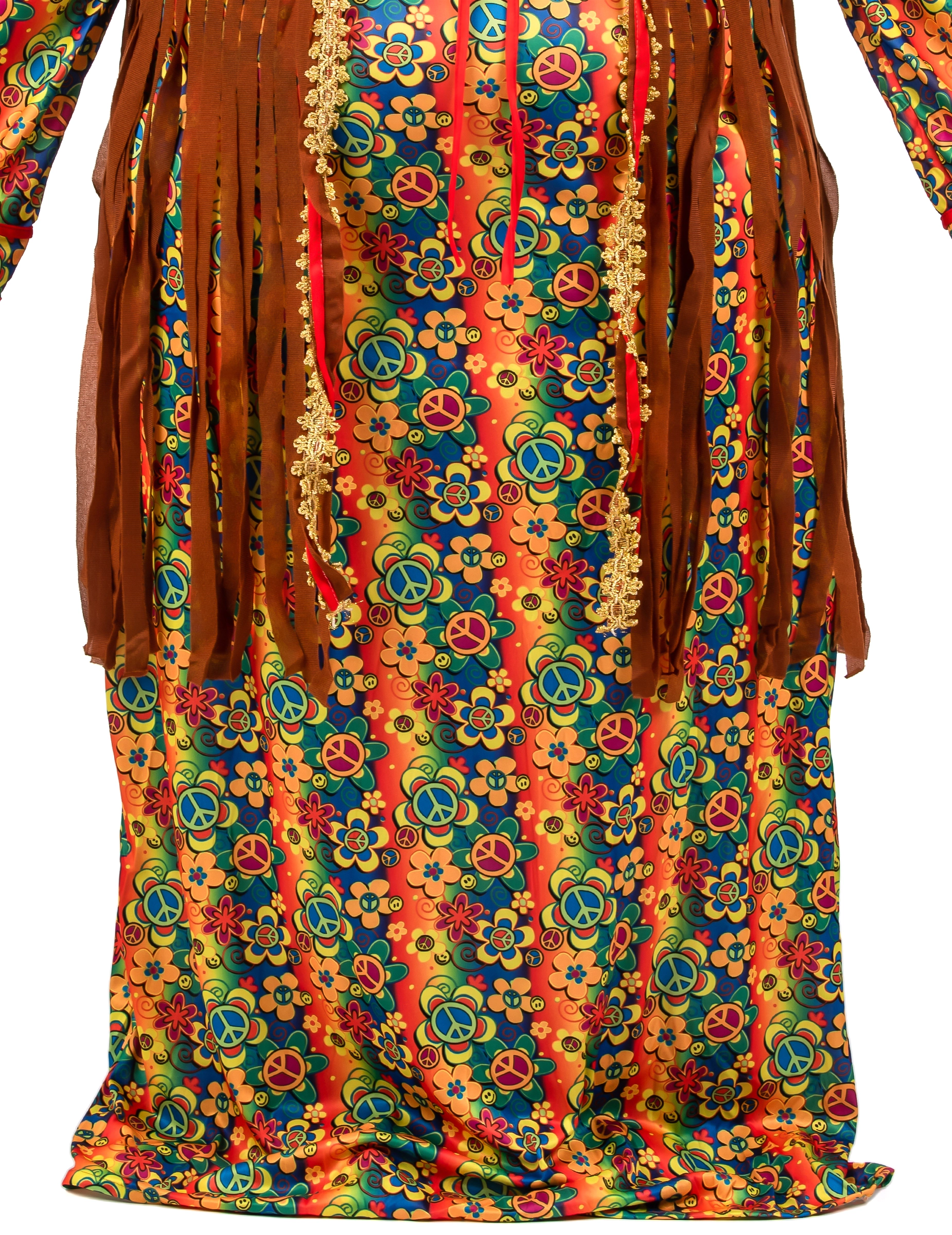Dit hippiekostuum voor volwassenen bestaat uit een jurk en een ketting. (Hoofdband, pruik, schoenen en ring niet inbegrepen.) De jurk is lang en is versierd met kleurrijke patronen, trouw aan de hippiestijl: love and peace symbolen, vrolijke smileys en veelkleurige bloemen.