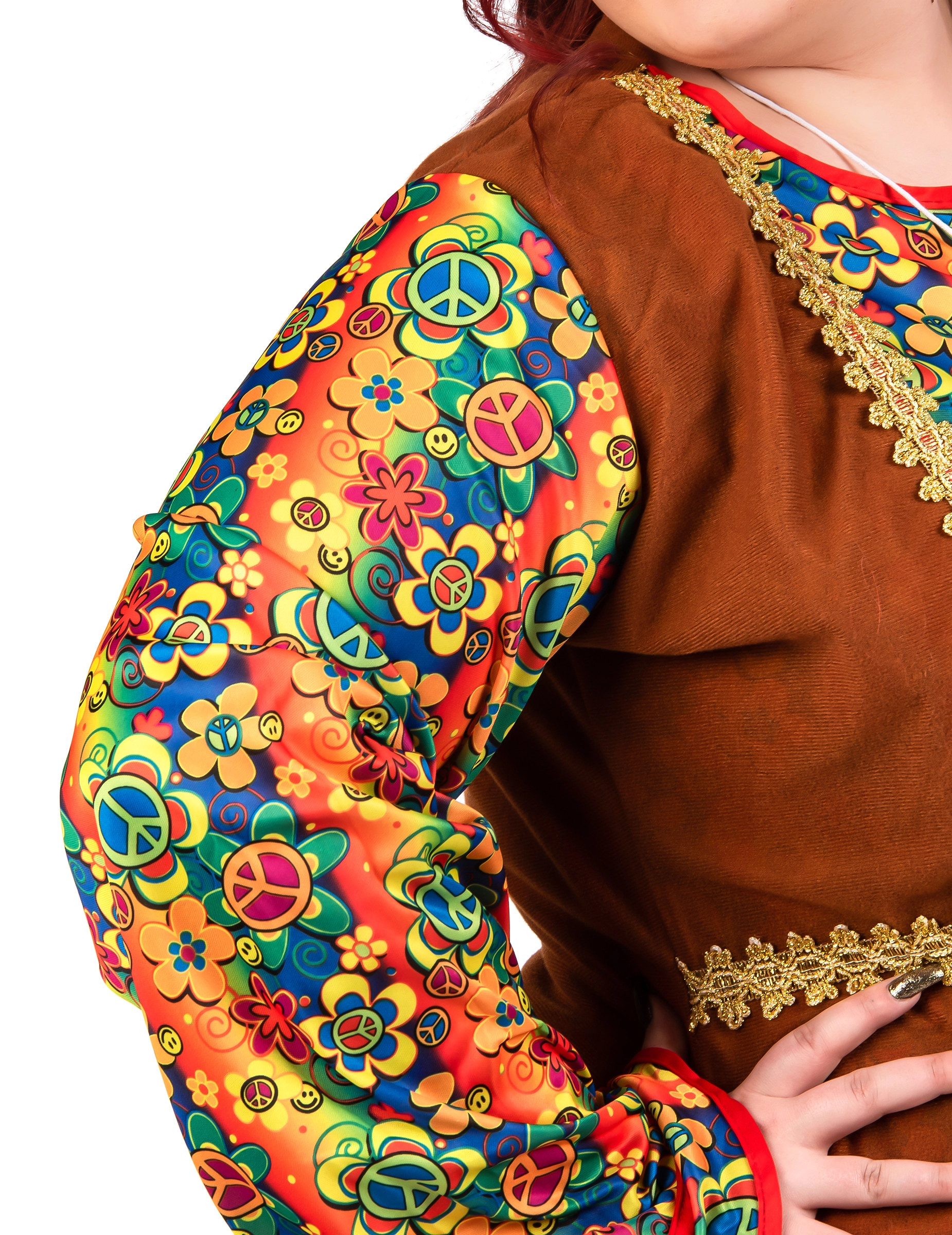 De jurk heeft lange, wijd uitlopende mouwen in de stijl van de jaren 70. Het bruine gilet dat erboven aan vastgemaakt is gemaakt van suède-achtig materiaal en is versierd met een goudkleurige rand en franjes. De inbegrepen ketting heeft het bekende love and peace symbool in het geel eraan bevestigd met een wit koord.