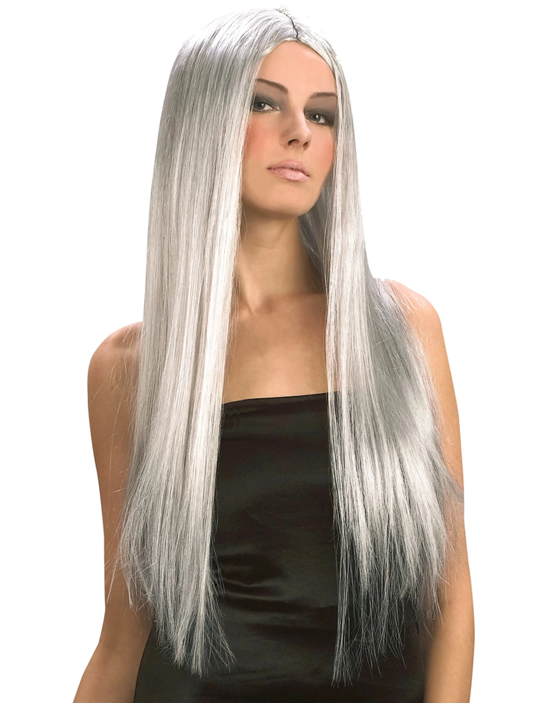 Deze lichtgrijze damespruik is 60 cm lang, de haren zijn stijl. Ideaal om uw outfit voor een verkleedpartijtje, Halloween of ander verkleedfeest compleet te maken.