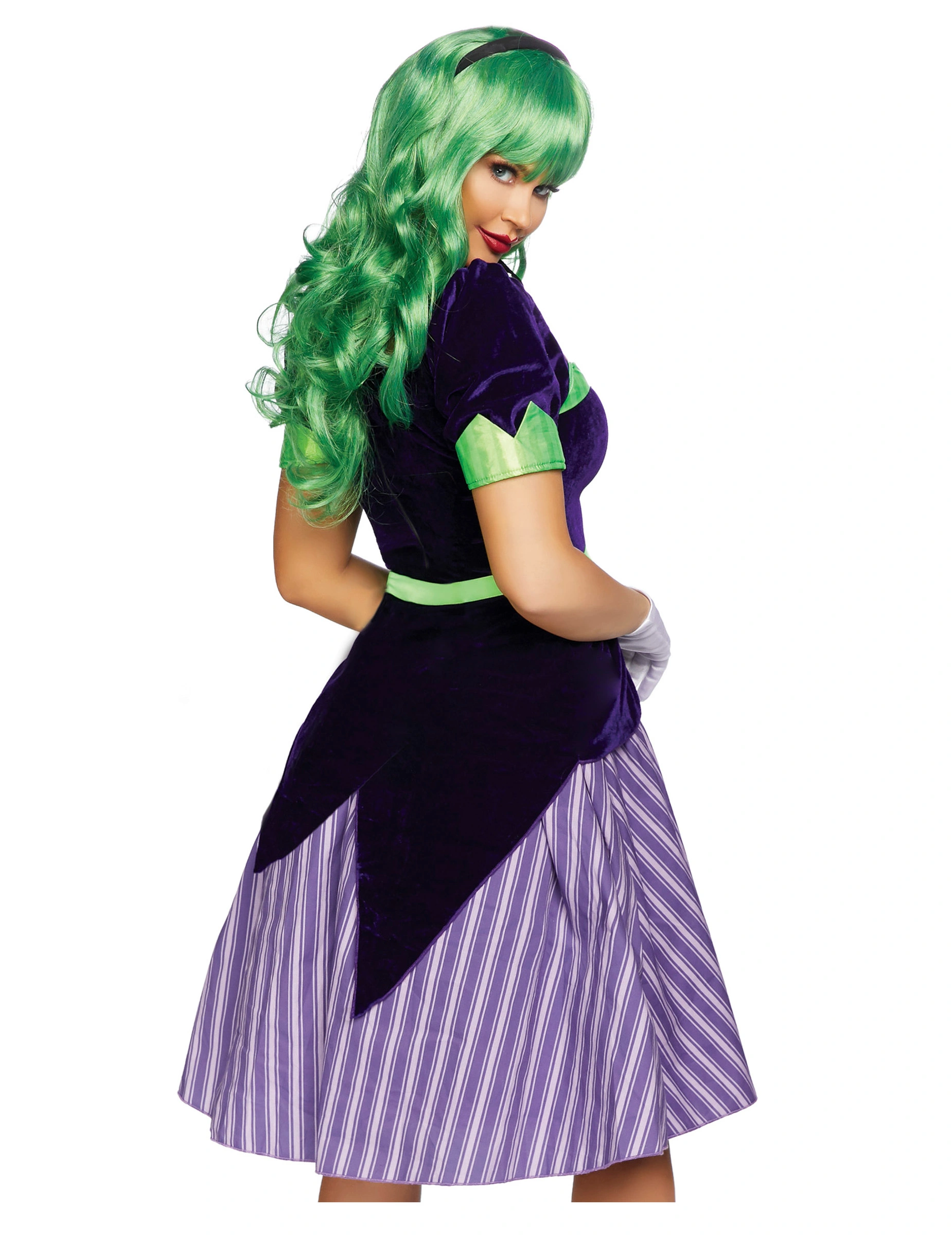 De rok heeft witte en paarse strepen en de riem kan om de taille geknoopt worden dankzij het groene lint, net als het lint dat om de hels geknoopt kan worden.
