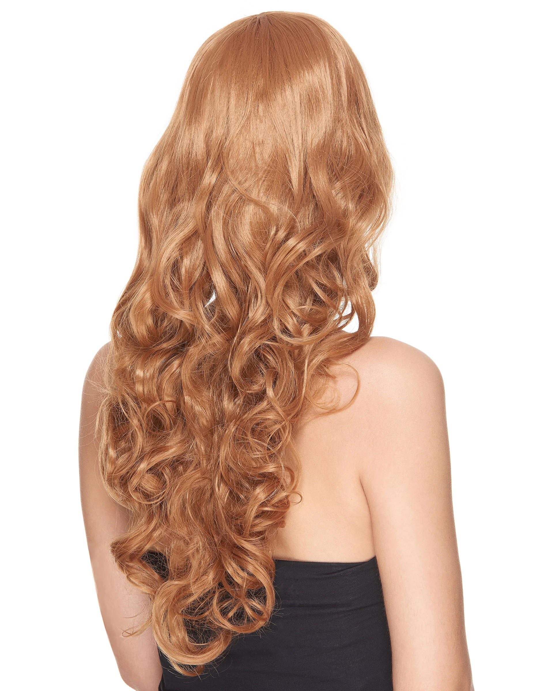 Deze luxe pruik voor vrouwen heeft lange synthetische kastanje bruine haren en een rechte pony. De haren zijn stijl bovenaan en krullend aan de onderkant.