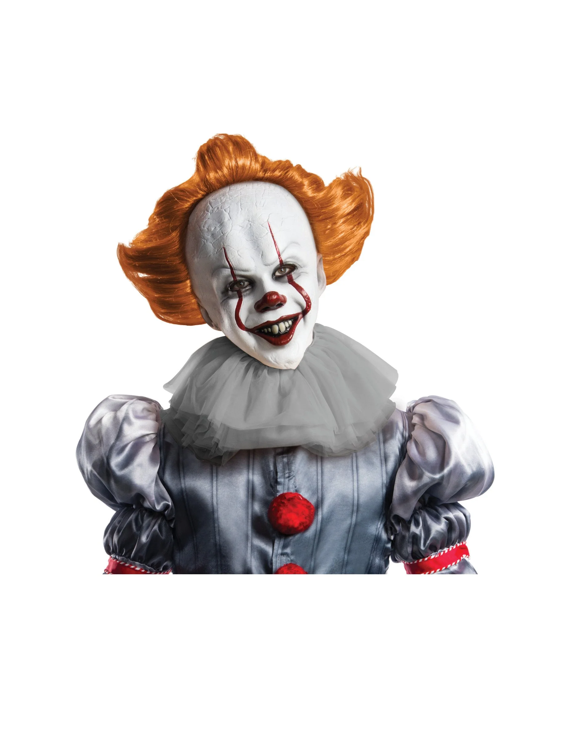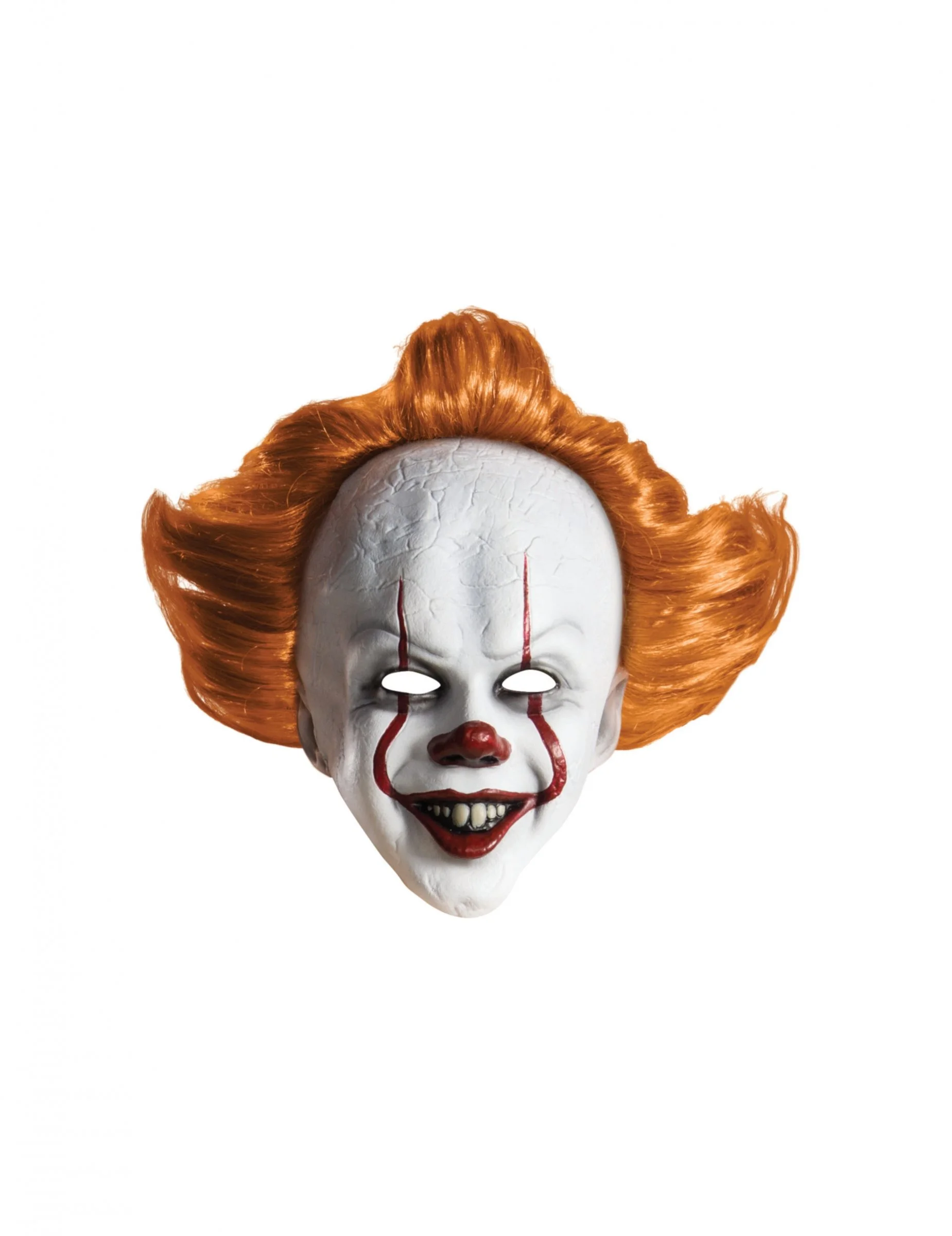 Ditangstaanjagende latex masker stelt het gezicht voor van de clown Pennywise. Een rode pruik die het haar van de clown voorstelt, geïntegreerd in het masker, maakt het geheel af.