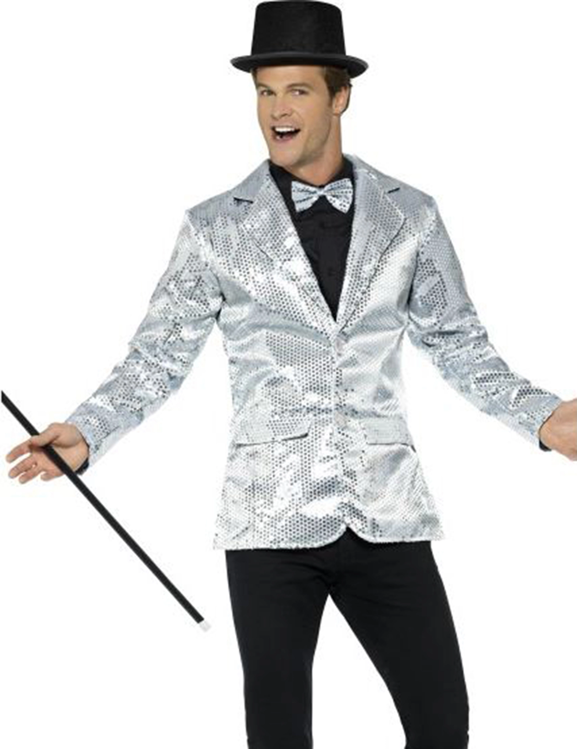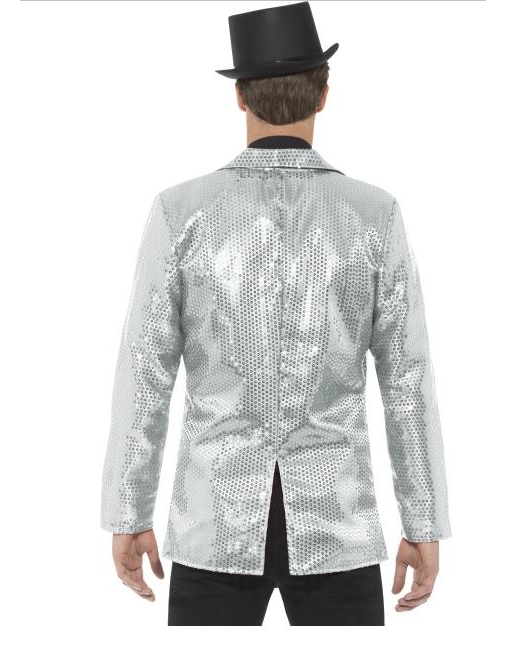 Dit disco jasje voor mannen is zilverkleurig en bedekt met lovertjes. (Alleen het jasje is inbegrepen.)
