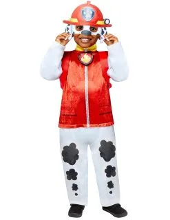 Onderofficiële Pat’Patrol™ licentie, het pak is wit met zwarte vlekken op de armen en benen die de beroemde Dalmatiër uit de Paw Patrol™ tekenfilm voorstellen. De top is rood van kleur en lijkt op het brandweeruniform van Marcus.
