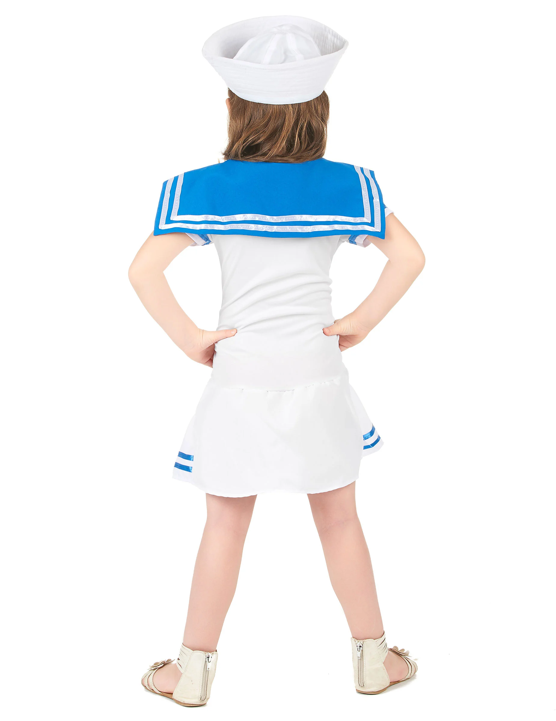 Dit marinierskostuum voor meisjes bevat een jurk en een hoedje. (Schoenen zijn niet inbegrepen.)