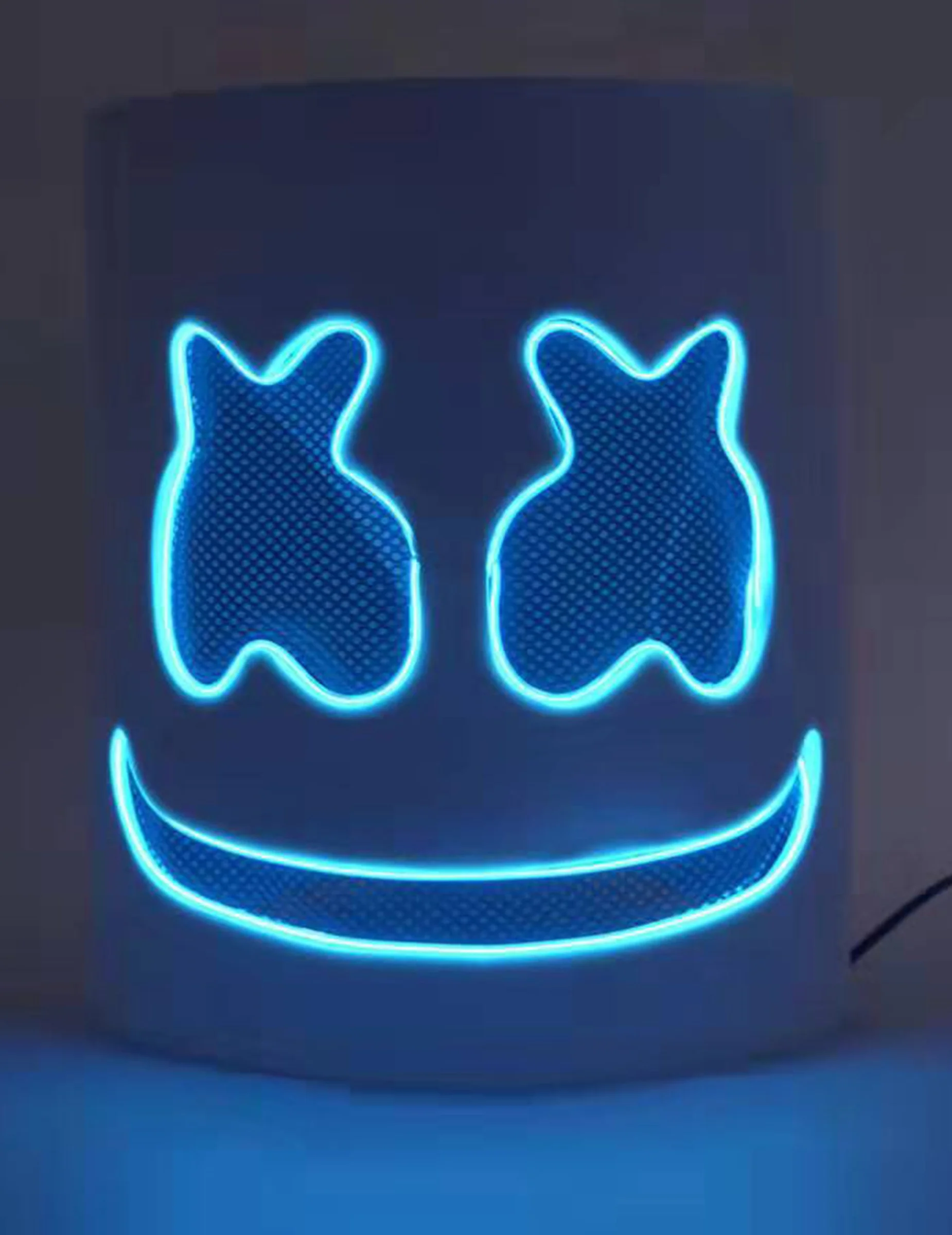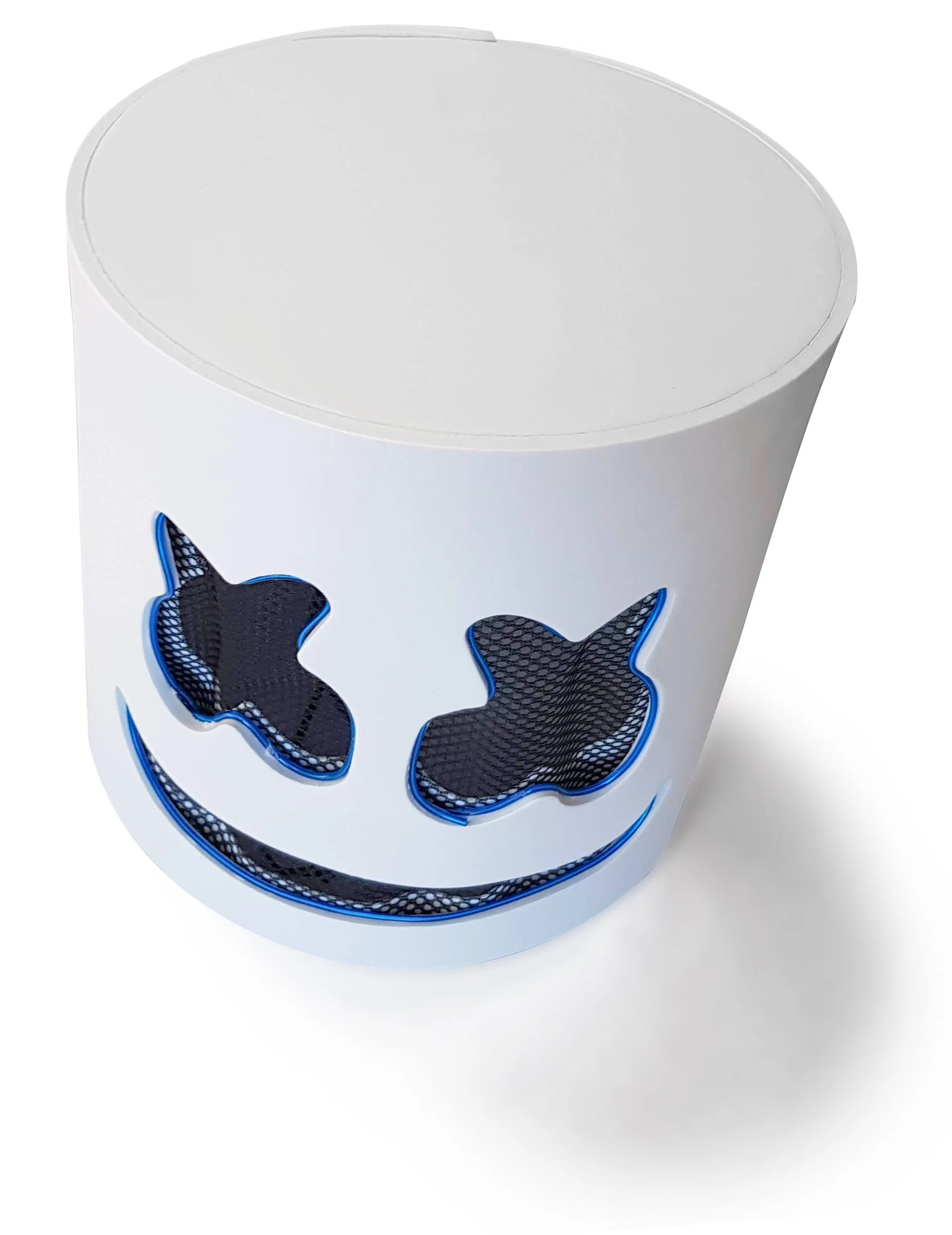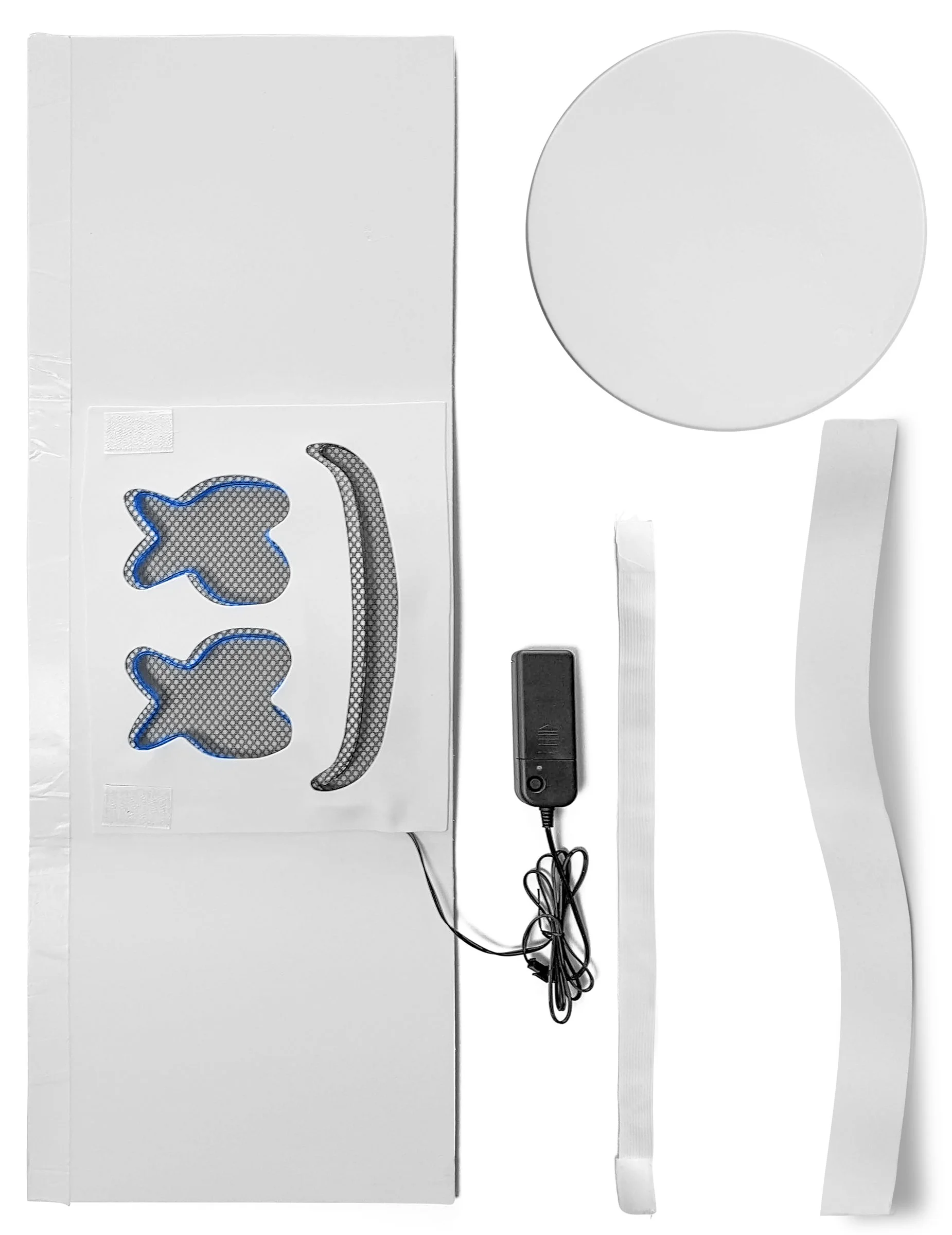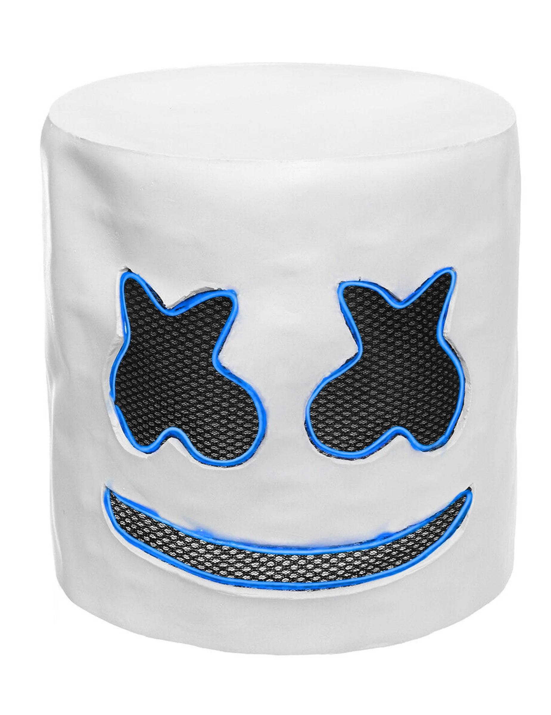 Dit masker wordt als set geleverd die je zelf in elkaar kunt zetten in enkele simpele stappen. Het masker is van een witte schuimstof gemaakt met openingen voor de ogen en de mond. De gaten worden bedekt met een zwarte gaasstof, zodat mensen niet in het masker kunnen kijken, maar jij er zelf wel goed doorheen kunt zien. De contouren rond de ogen en de mond zijn voorzien van LED verlichting die blauw oplichten wanneer je deze aan zet. Er zijn 3 functies: continue aan, langzaam knipperen en snel knipperen. Voor een goede pasvorm is schuim en een elastiek aanwezig aan de binnenkant van het merk. Hierdoor zal het masker goed blijven zitten.
