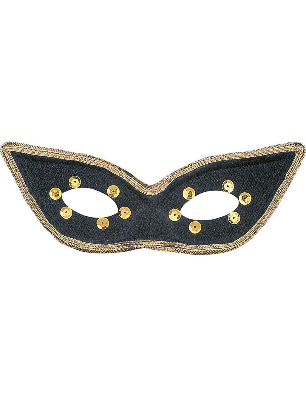 Dit prachtig masker voor volwassenen heeft een zwarte kleur. Versierd met een goudkleurig galon over het geheel. Goudkleuirge lovertjes zijn ter hoogte van de ogen terug te vinden.