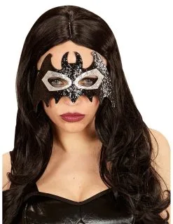 Dit glitter masker voor volwassenen is ongeveer 20 cm breed. Het stelt een vleermuis voor met zwarte en zilverkleurige pailletten. Het masker is voorzien van een zwart elastiek om deze aan het gezicht te dragen.