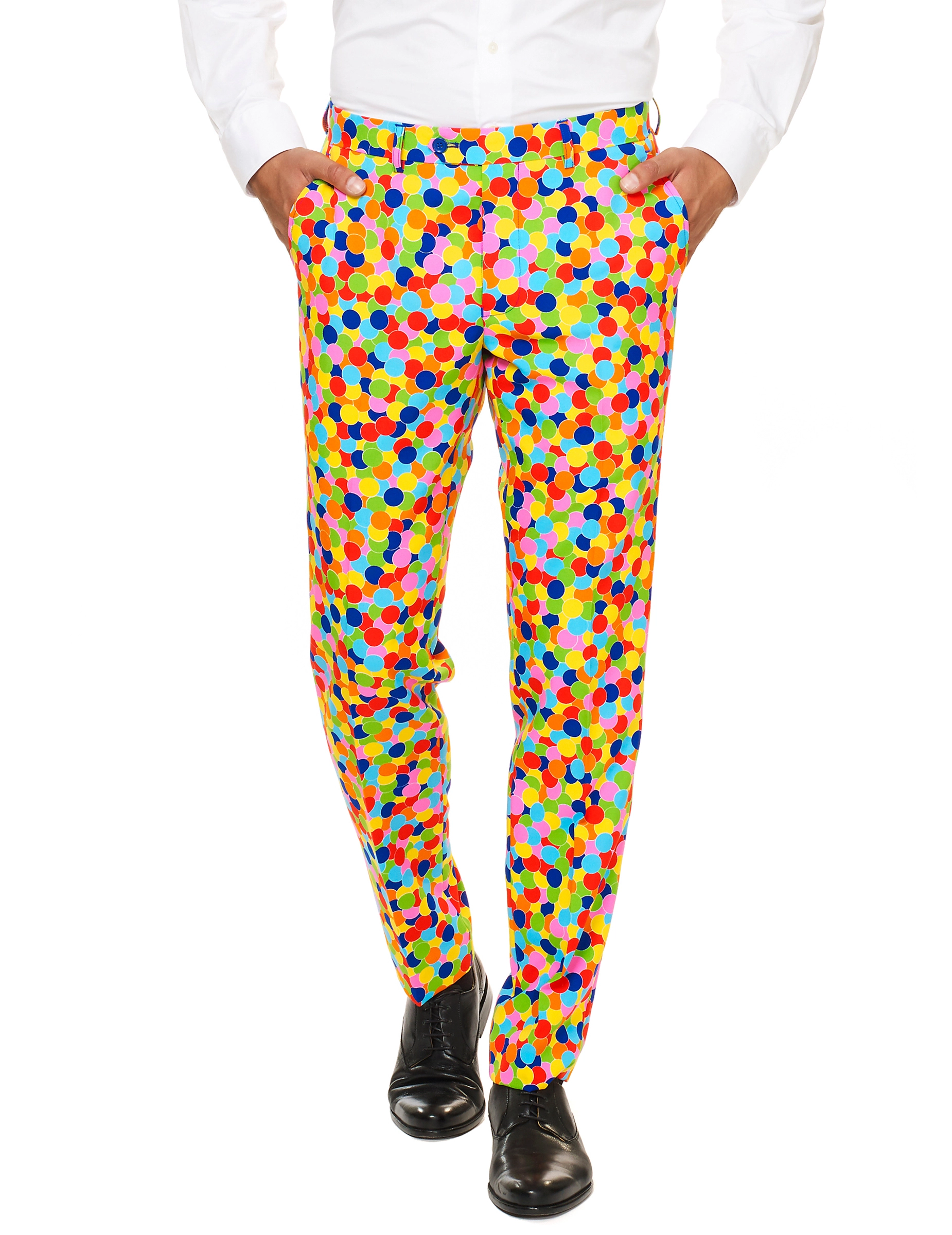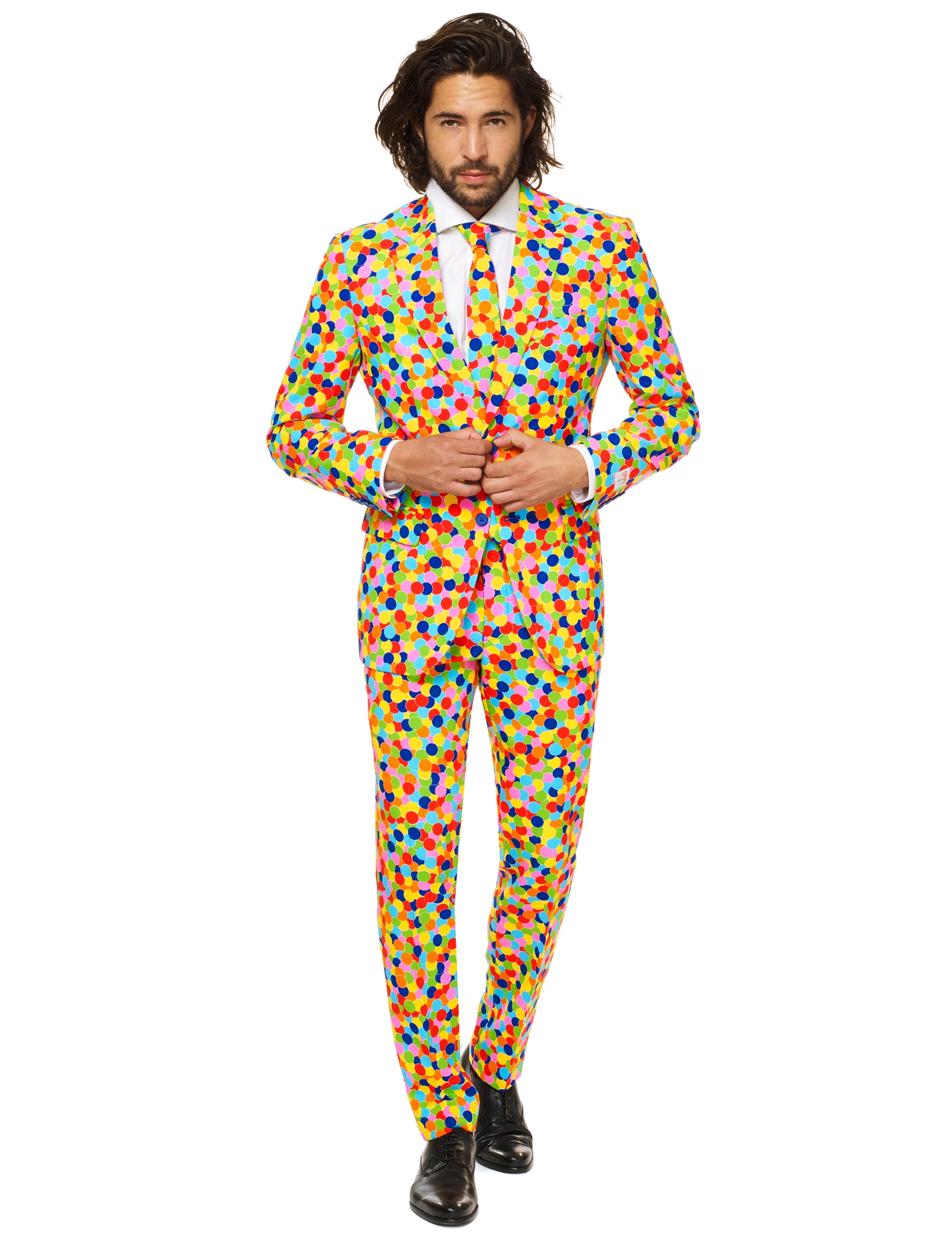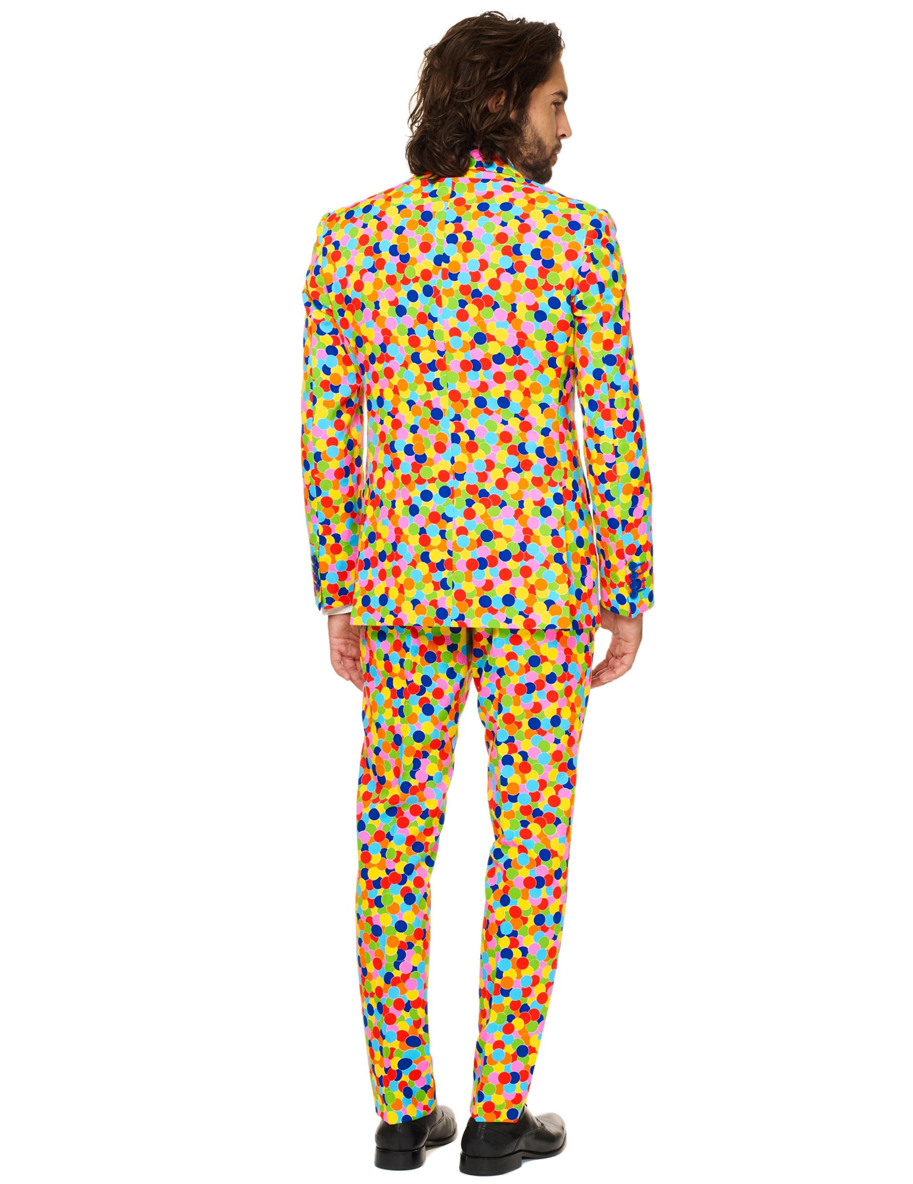 Dit Mr. Confetti kostuum voor mannen heeft de officiële Opposuits™ licentie. Het bestaat uit een colbert, een stropdas en een broek met veelkleurige stippen. (Blouse en schoenen niet inbegrepen.)
