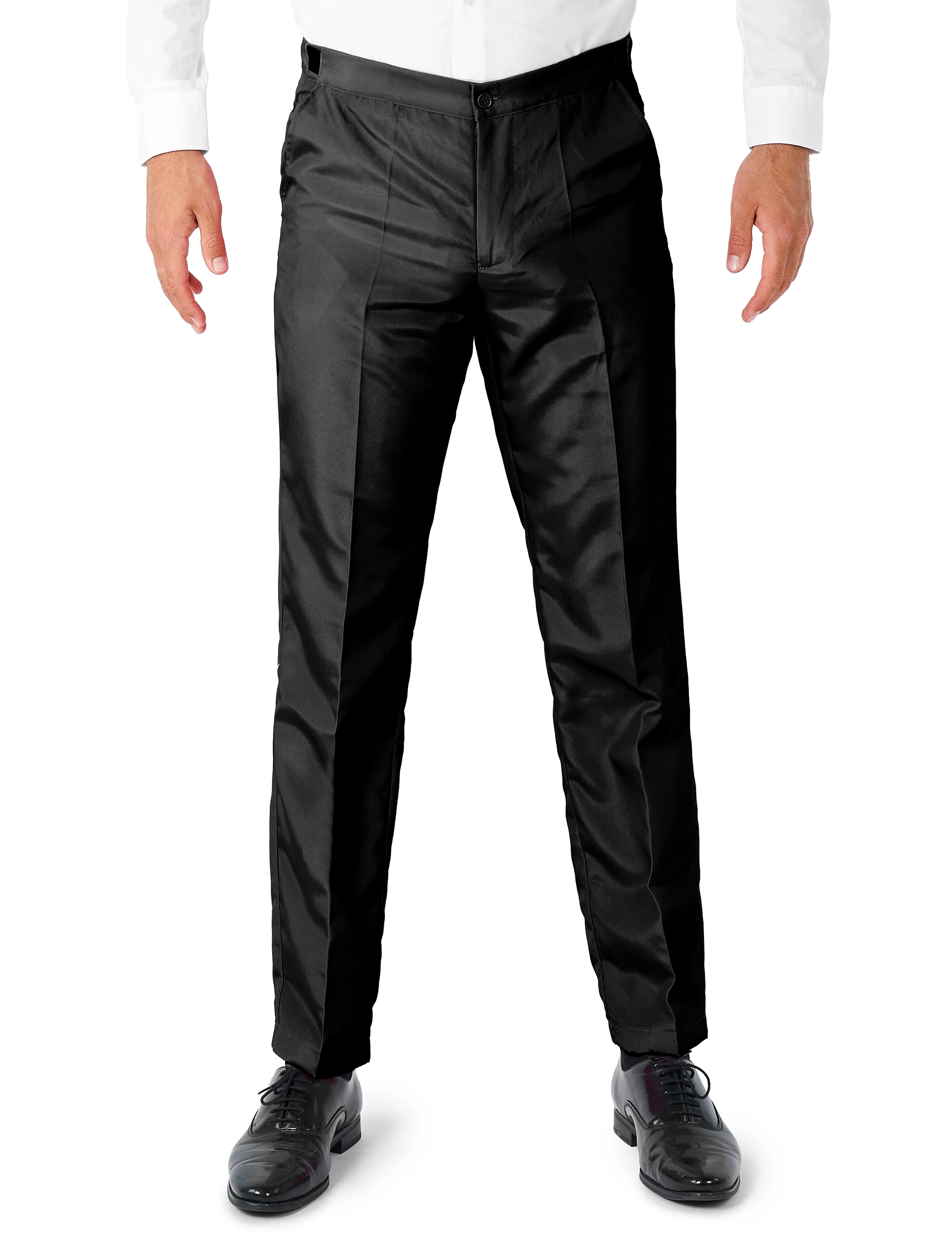De zwarte broek is eenvoudig te sluiten met een rits en een knoop. Het heeft twee zakken aan de zijkanten. De zwarte stropdas maakt de outfit compleet.