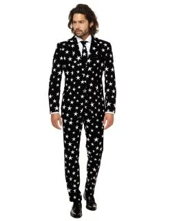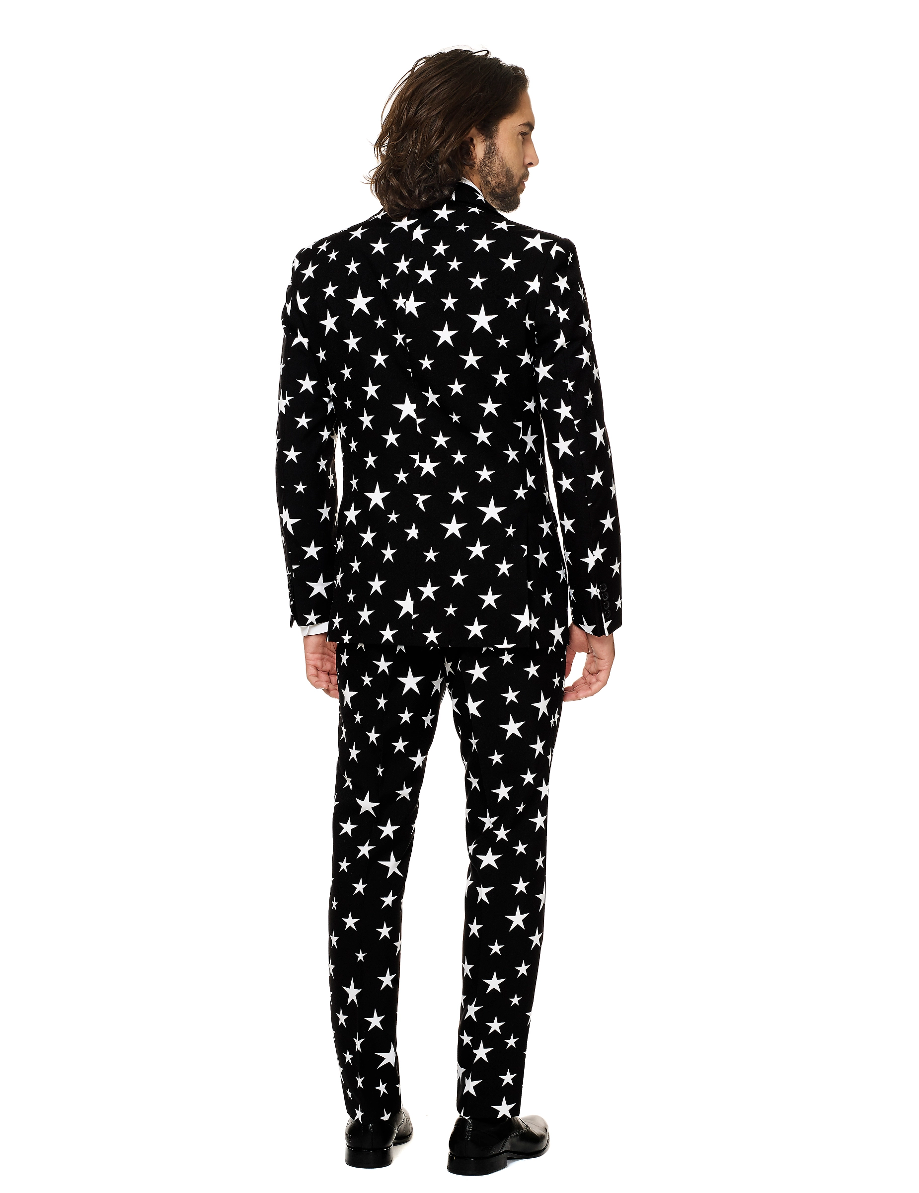 Het geheel is een zwarte achtergrond met witte sterren patronen als opdruk. Het jasje is gevoerd en de broek kan gesloten worden met een rits. De stropdas is ook zwart met sterren patronen en kan eenvoudig om de nek geknoopt worden.