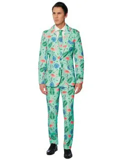 De outfit is lichtgroen en heeft een veelkleurige tropische opdruk. Het jasje kan gesloten worden met een knoop aan de voorkant. De stropdas en de broek met opdruk maken de outfit compleet.