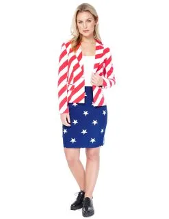 Dit Opposuits™ kostuum voor vrouwen bestaat uit een colbert en een rok. (Bovenstuk en schoenen niet inbegrepen.) Het colbert is gemaakt van een mooi stof met witte en rode strepen. Twee neppe zakken zijn te vinden aan de zijkanten en kan gesloten worden met een knoop.