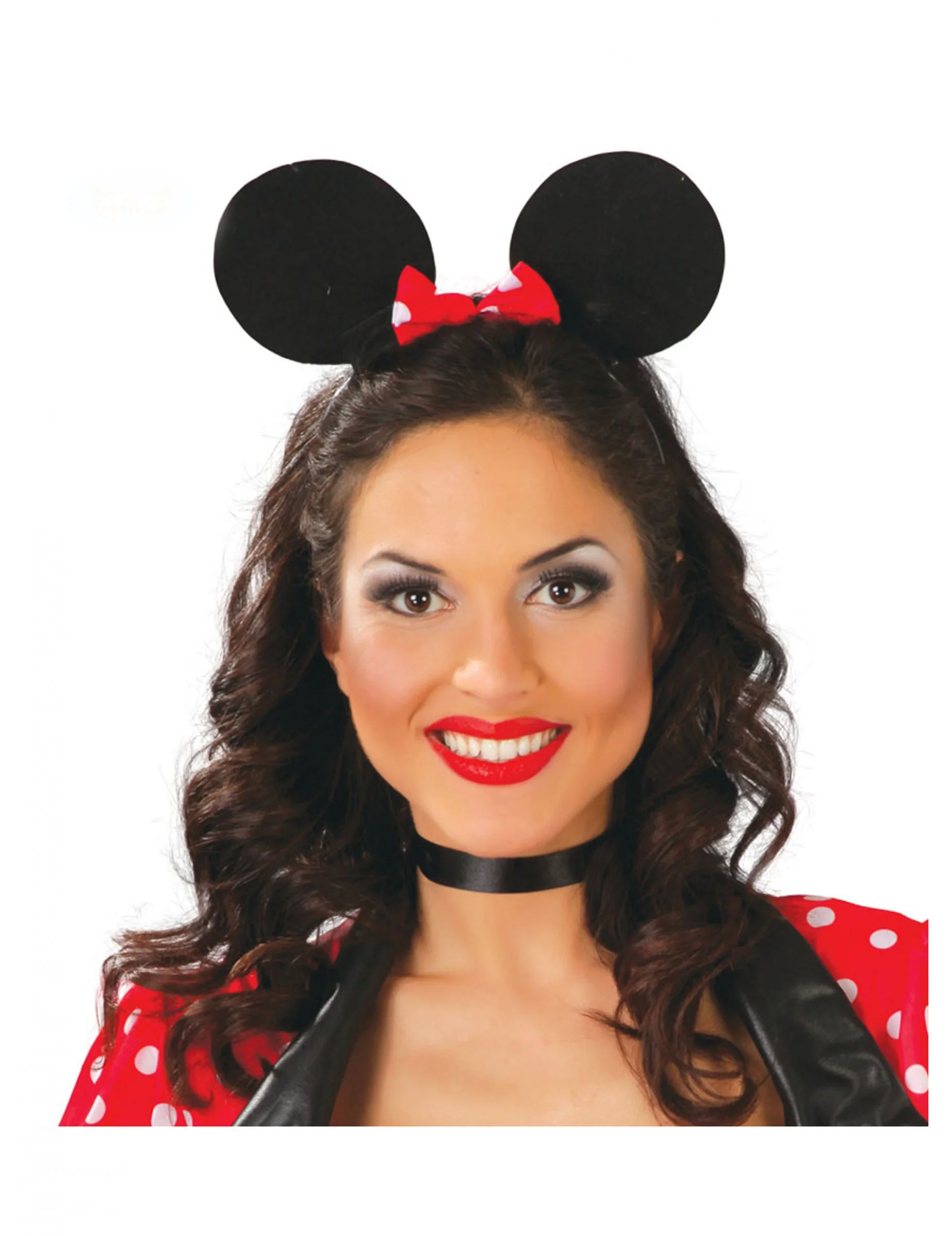 Deze muizen haarband voor volwassenen heeft grote ronde oren erop bevestigd met in het midden een rode strik met witte stippen.