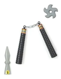 Deze ninja set voor kinderen bevat een nunchaku, een ninja ster en een dolk.