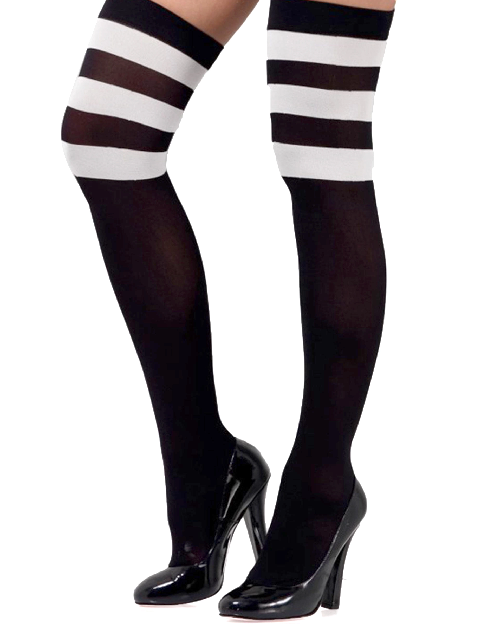 De zwarte kousen zijn ondoorzichtig en zijn versierd met 3 witte strepen aan de bovenkant.