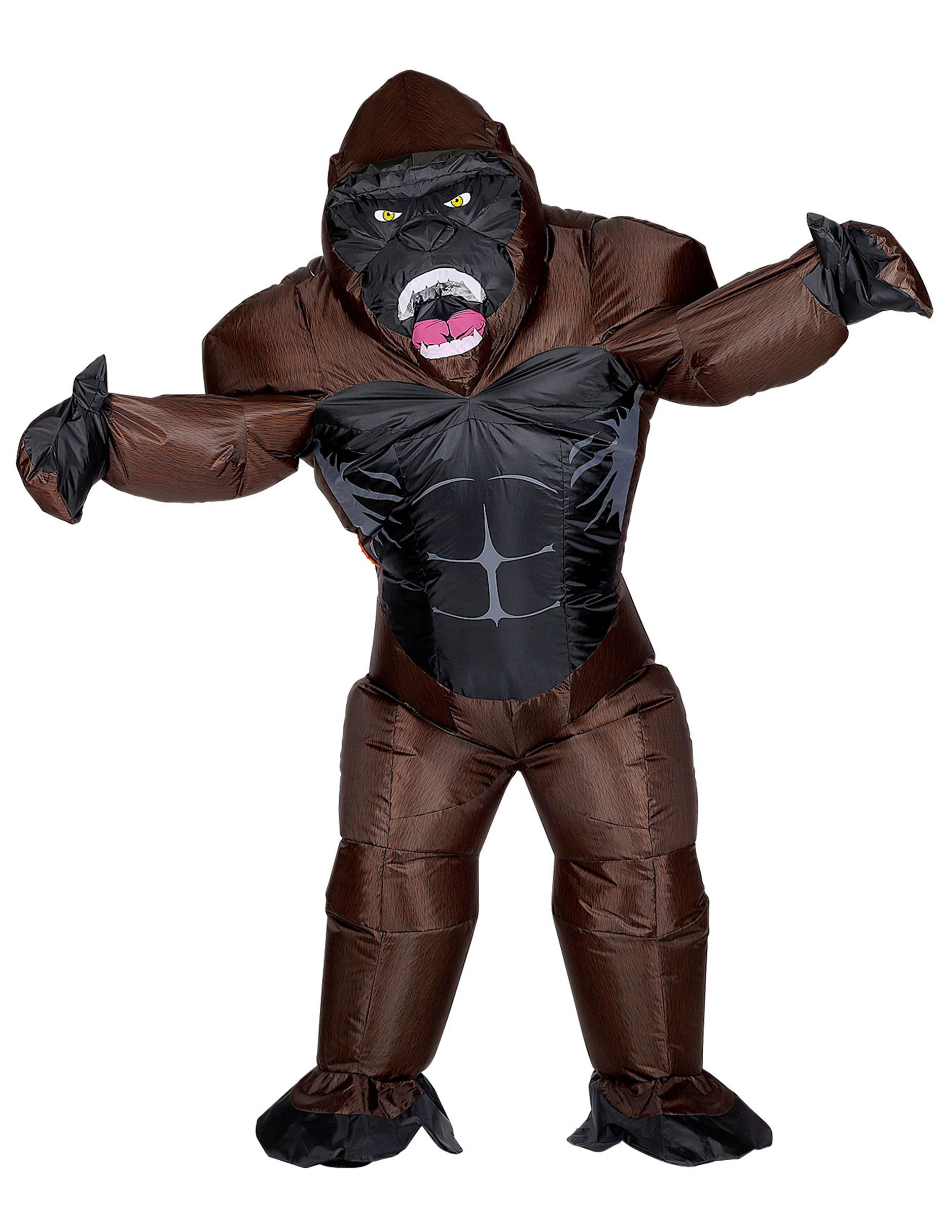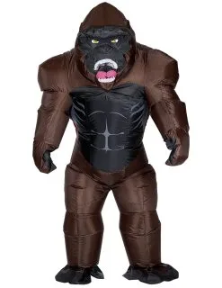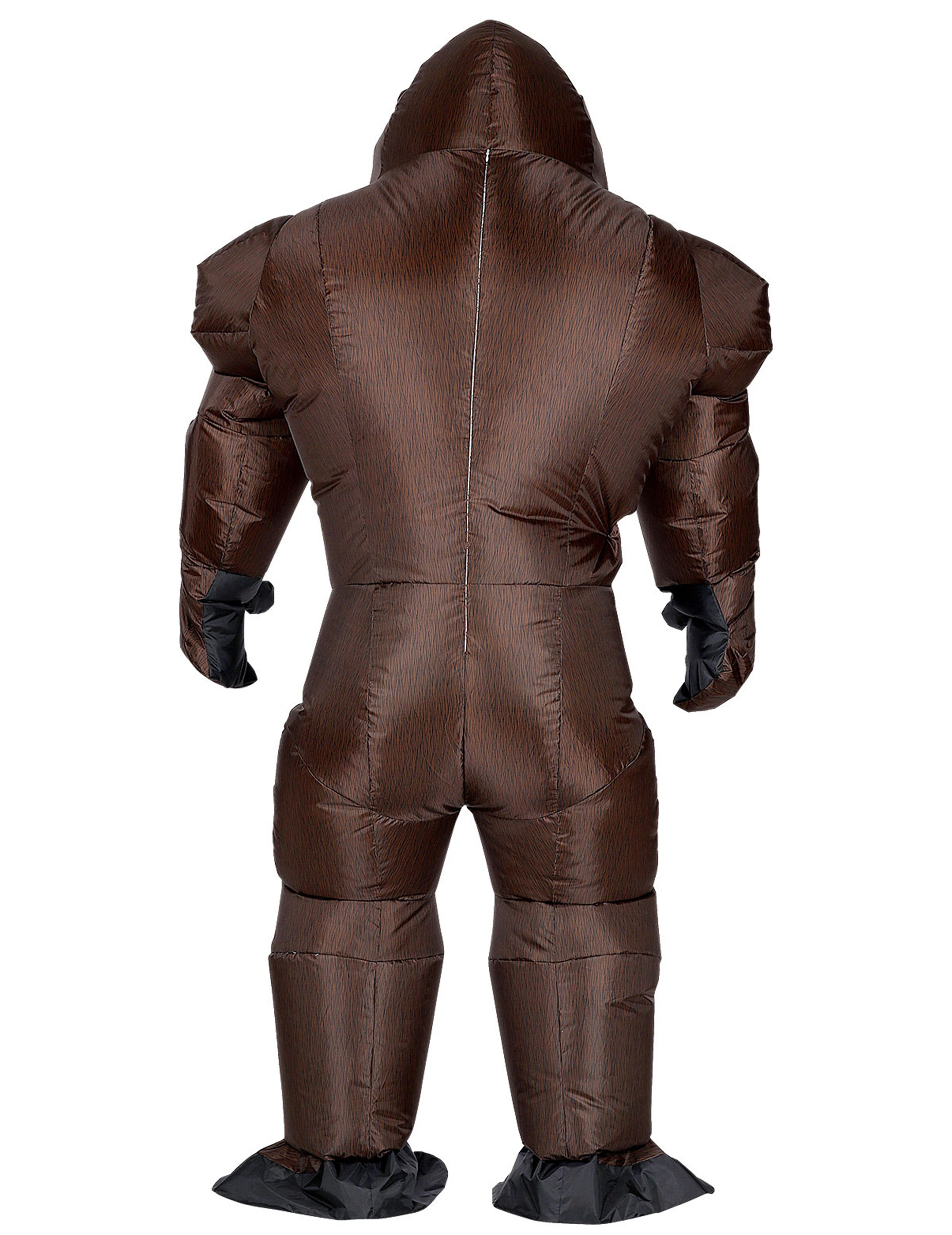 Het bruine pak stelt een gorilla voor en is op te blazen met een ventilator die werkt op batterijen (niet inbegrepen).