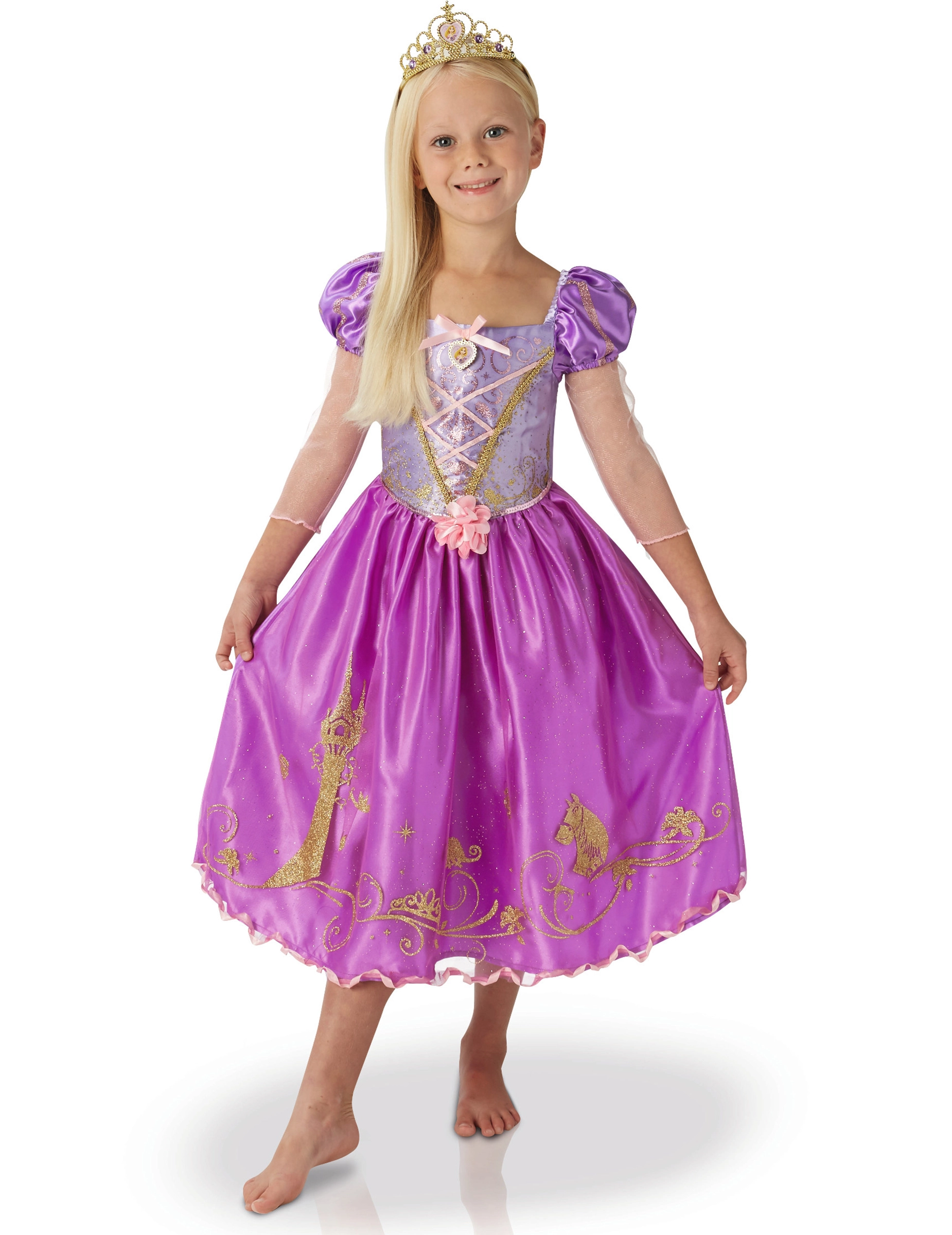 De jurk is gemaakt van paars satijnachtig stof. De bovenkant van de jurk is versierd met goudkleurige randen, een klein roze satijnstrik en een hanger met het portret van Raponsje™. De taille is elastisch en versierd met een mooie roze bloem. De onderkant van de jurk bevat paars glitter tule met goudkleurige flitter patronen en een satijnachtig roze lint. De pofmouwen bevatten roze sluierstof bij de armen.