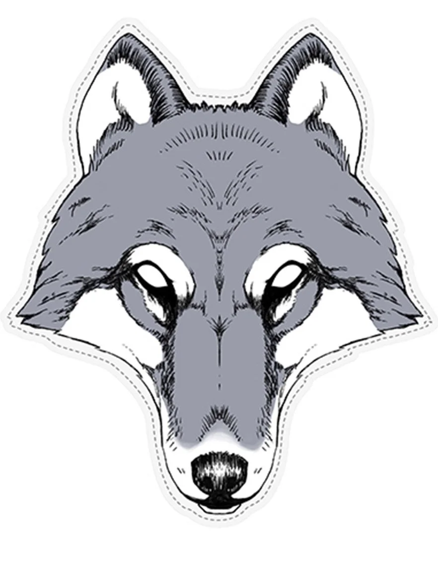 Het is een grijs en wit wolvenmasker. Het is 28 x 32 cm groot en heeft openingen rond de ogen wat een perfect zicht garandeerd. Een wit elastiek, bevestigd aan elk uiteinde zorgt ervoor dat het masker op uw gezicht blijft zitten.