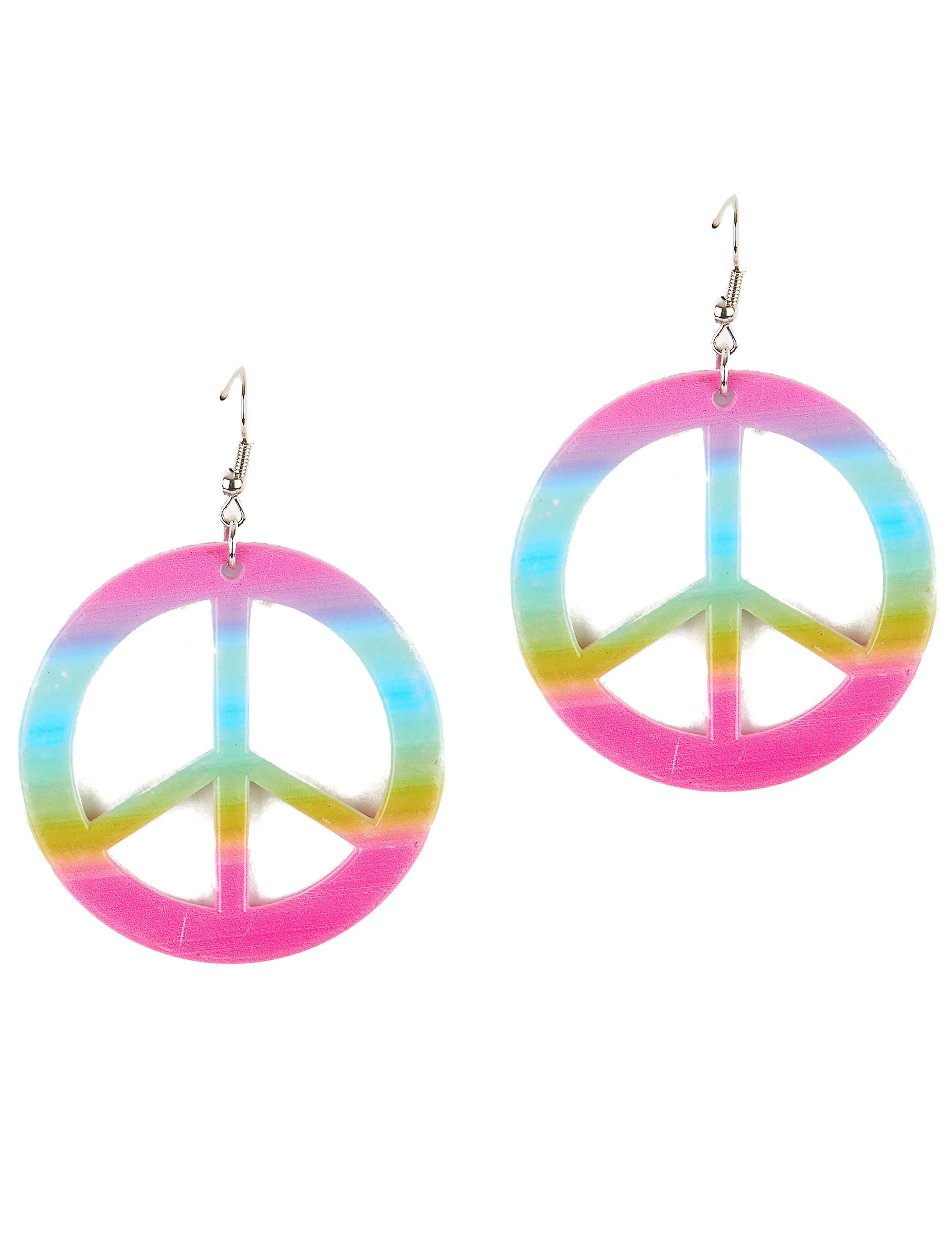 Deze oorbellen voor volwassenen zijn gemaakt van plastic. Deze zijn in de vorm van het Peace & Love symbool. De oorbellen zijn veelkleurig en de haakjes zijn van metaal. Voor deze oorbellen zijn gaatjes in de oren nodig.