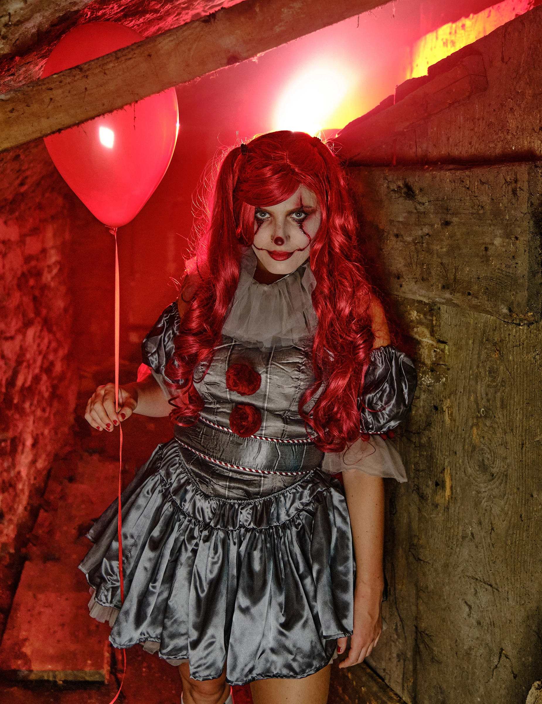 De grijze jurk is bovenaan nauwsluitend met twee rode pluchen kwastjes die in de buste zijn genaaid. De onderkant van deze jurk is gemaakt van een lichtgrijze pof tule waarop een satijnen rok is gesuperponeerd eveneens met franje. De manchetten maken dit angstaanjagende clownkostuum compleet en zijn versierd met tule.
