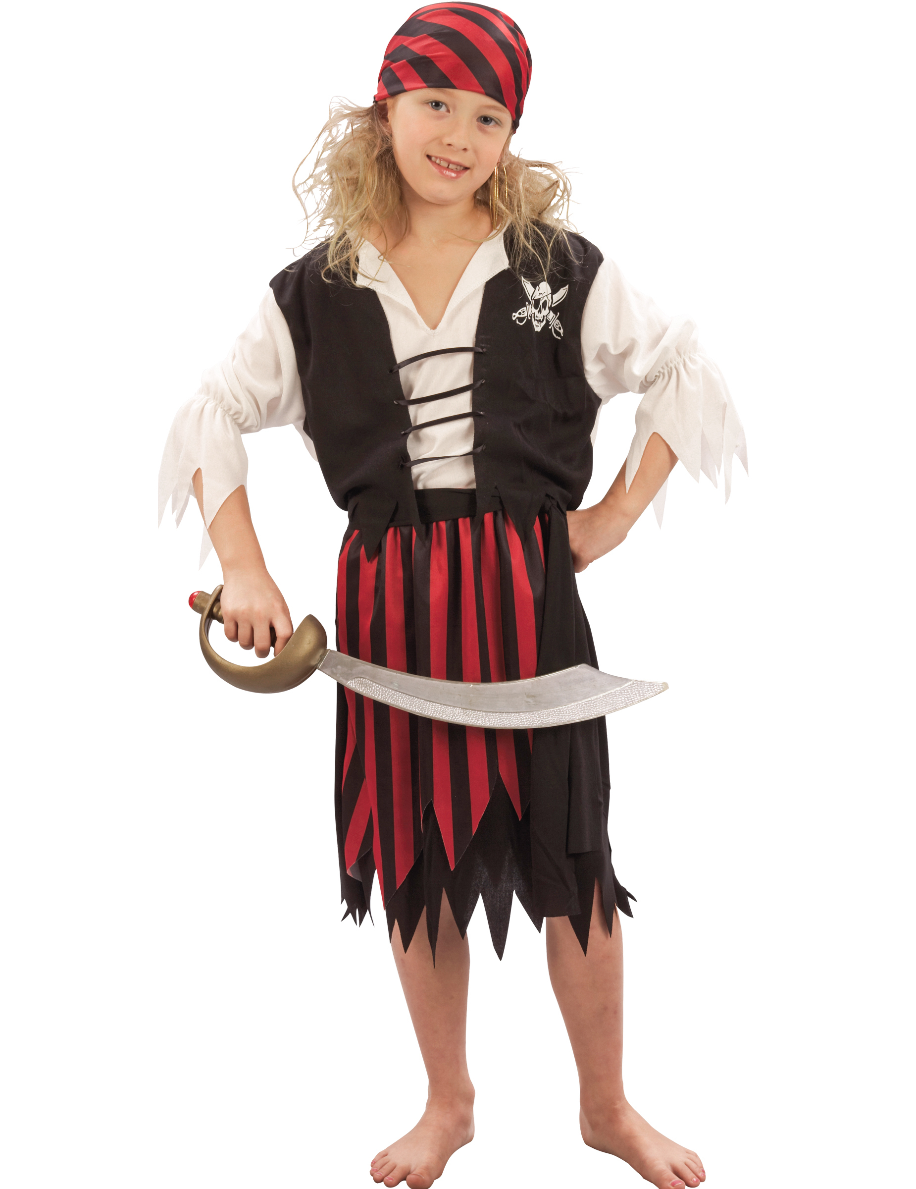 Dit piratenkostuum voor meisjes bestaat uit een wijde witte blouse met driekwart mouwen en ingewerkt zwart gilet. Een witte doodskop werd op de linkerzijde van de borst gedrukt en de kraag is gekarteld (Sabel niet inbegrepen). Een eveneens gekartelde rok in rood en zwart, een bijpassende bandana en een zwarte riem werken dit kostuum af en maken het ideaal voor carnaval, een voorstelling of eender welk ander verkleedpartijtje.