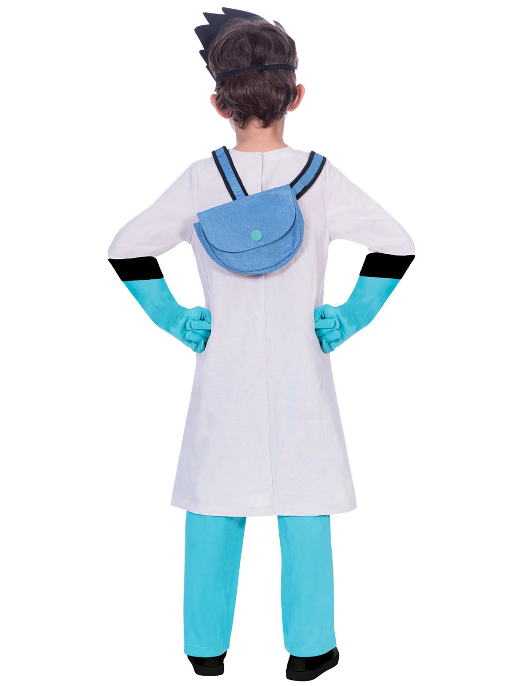 Het bovenstuk kan gesloten worden aan de achterkant met een klittenbandsluiting. Het stelt een witte labjas voor.