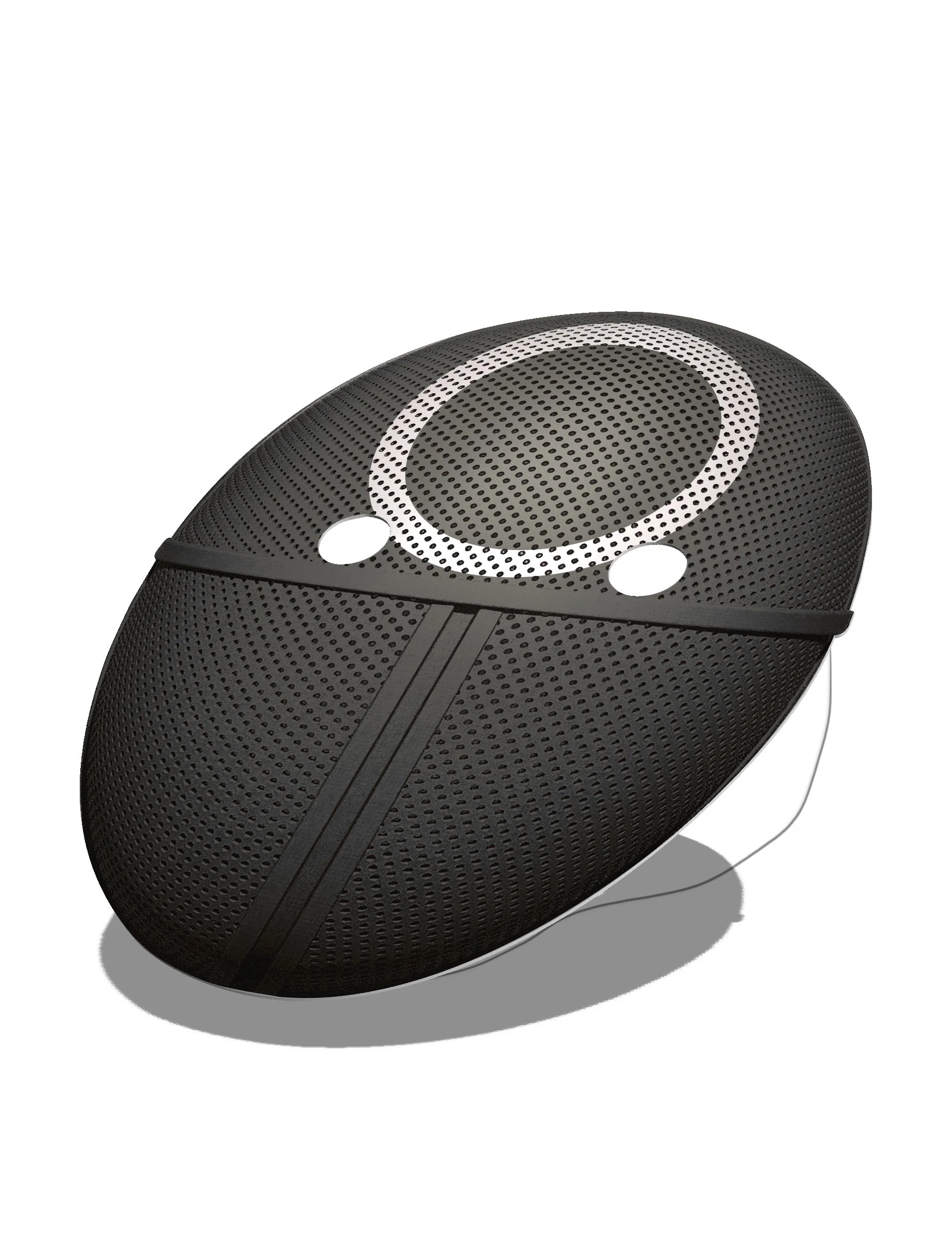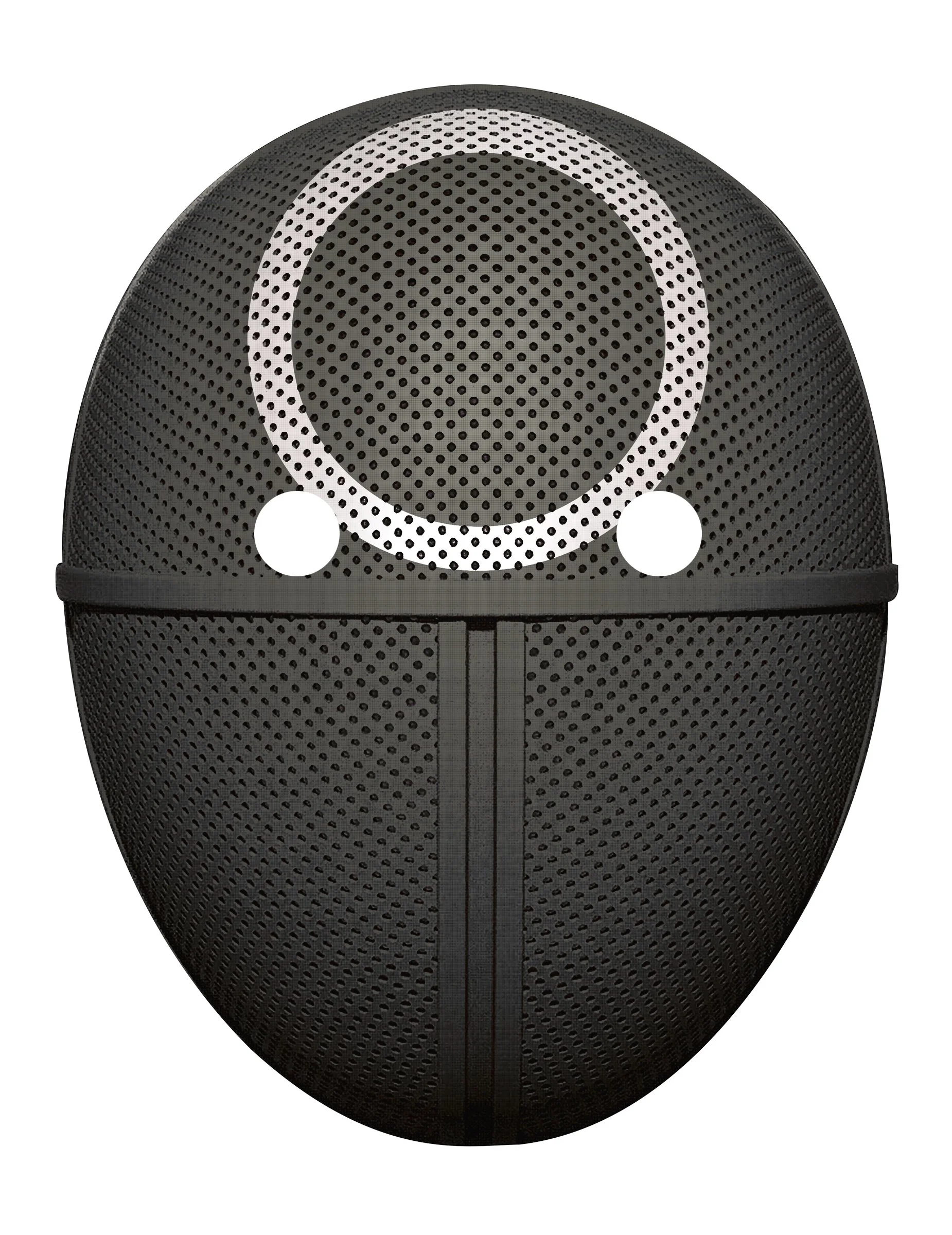 Het is gemaakt van plat karton, ovaal van vorm en zwart van kleur met een witte cirkel op het voorhoofd. Het masker heeft openingen voor de ogen.
