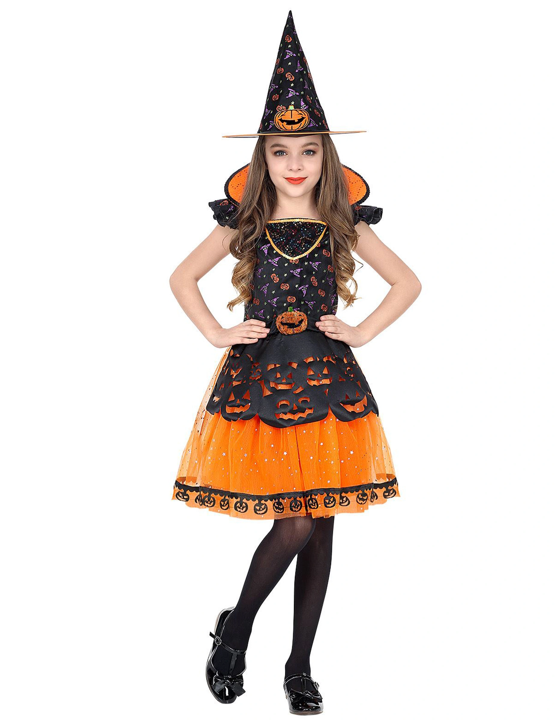 Dit pompoen heks kostuum is voor meisjes. Het bestaat uit een jurk en een hoed (panty, bezem en schoenen niet inbegrepen).