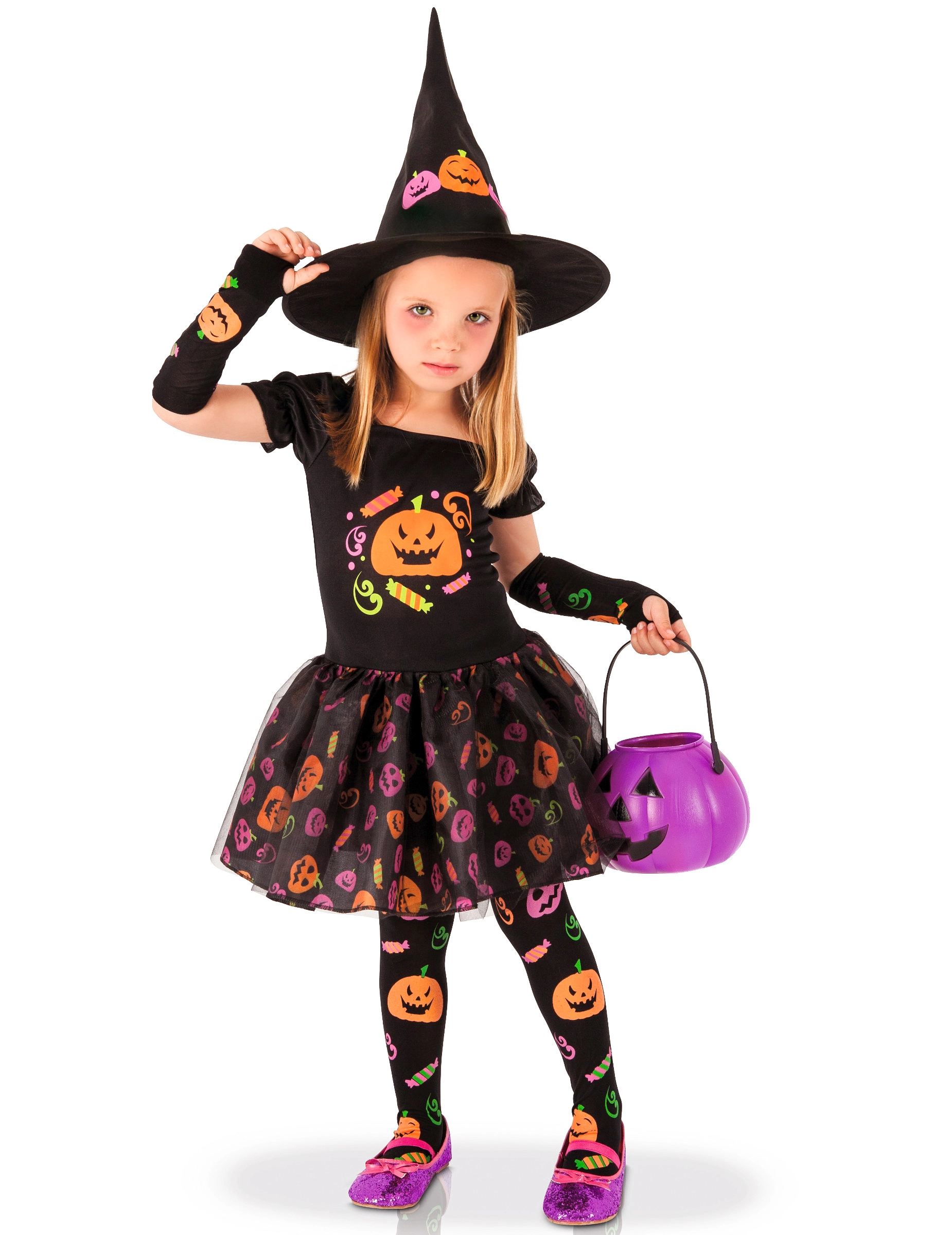 De jurk is zwart en heeft een pompoen opdruk. Het heeft een t-shirt met korte mouwen en een opdruk op de tutu. De legging, handschoenen en en heksenhoed zijn ook voorzien van pompoenen en maken het kostuum compleet.