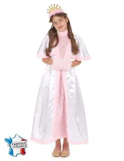 De lange jurk is wit, en heeft een glimmend satijn effect. Deze bevat in het midden een roze tulle stof, met goudkleurige strik motieven. De kraag, de mouwen, het midden en de onderkant van de jurk zijn versierd met stroken roze nep bond. De jurk sluit gemakkelijk aan de achterkant door middel van klittenbandsluitingen.
