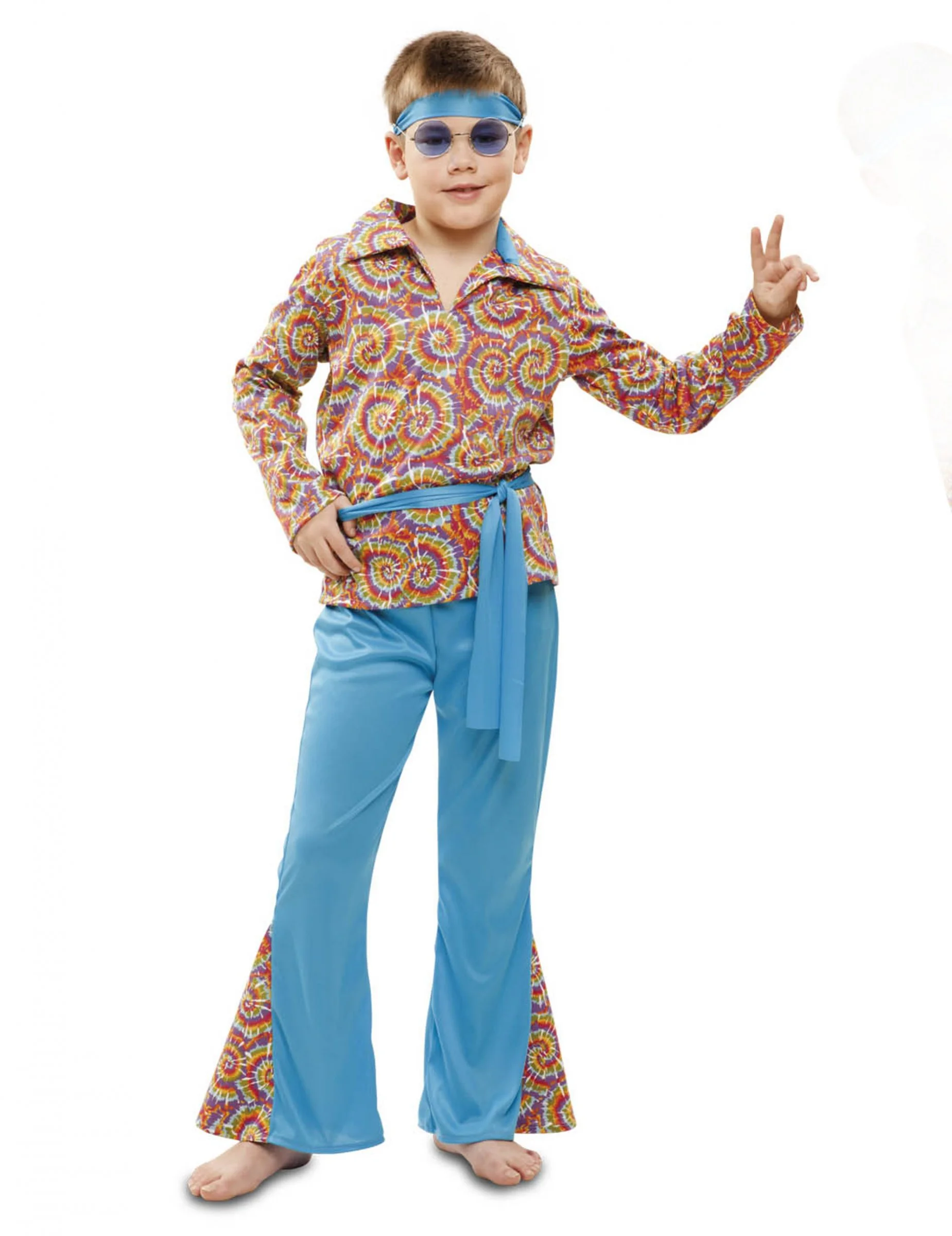 Dit hippie kostuum voor jongens bestaat uit een bovenstuk, broek, hoordband en riem (bril niet inbegrepen).