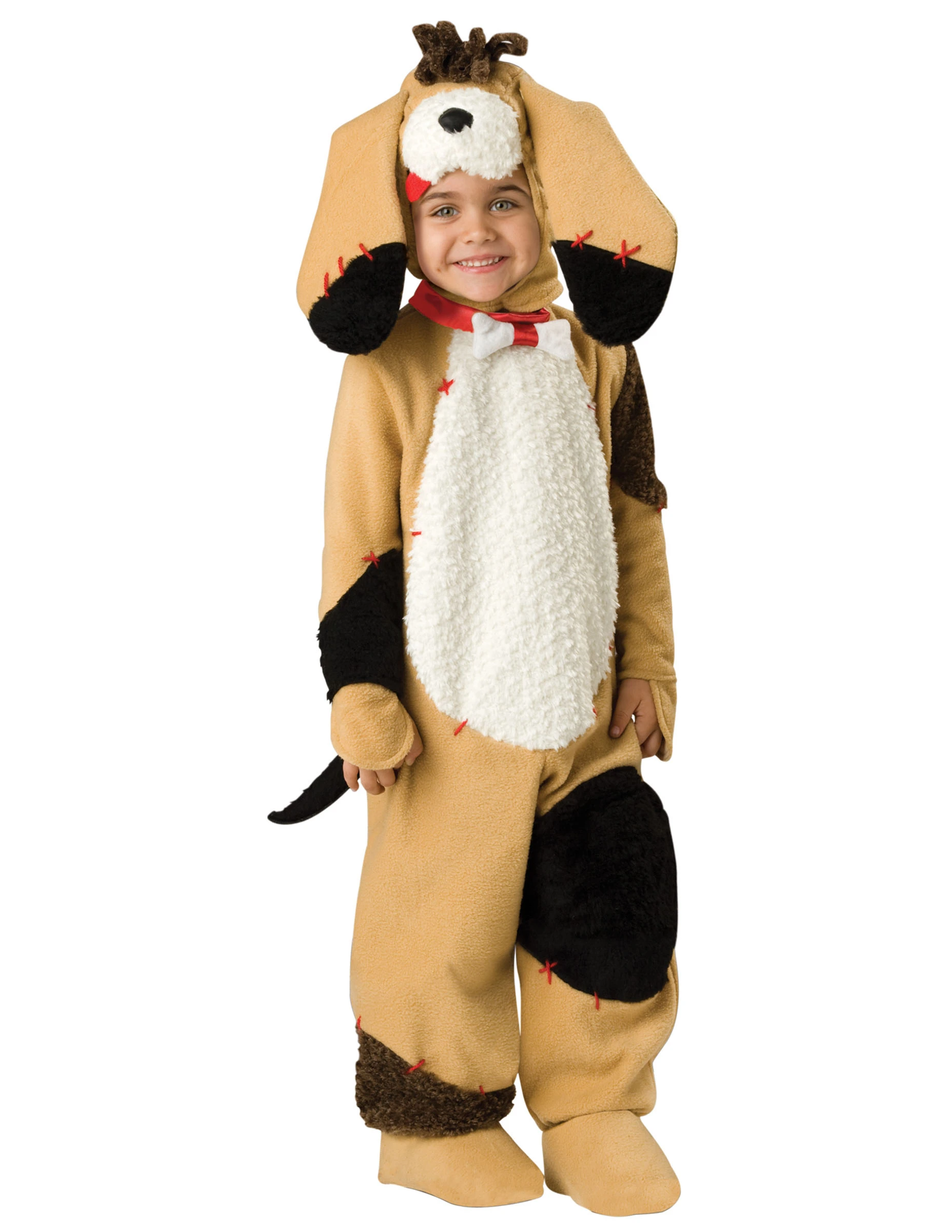 Dit puppy kostuum voor kinderen bestaat uit een eendelig dubbelgevoerd pak met rits en een afneembare staart aan de achterkant, aangevuld met een kraag met een bot, een muts met oren en een snuit, en bijpassende overschoenen.