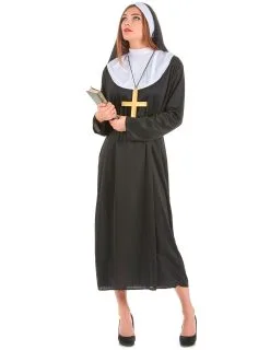 Dit nonnen kostuum voor dames bestaat uit een lange zwarte jurk , een grote witte kraag en een hoofddoekje. De jurk sluit bovenaan met een klittenband waardoor het perfect op uw lichaam blijft zitten. (Riem, bijbel en kruis niet inbegrepen).