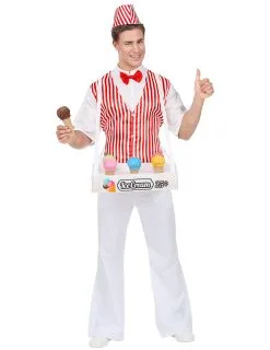Dit ijsverkoper kostuum voor mannen bestaat uit een blouse met gilet, een strikje, een hoed en een plateau met ijsjes.
