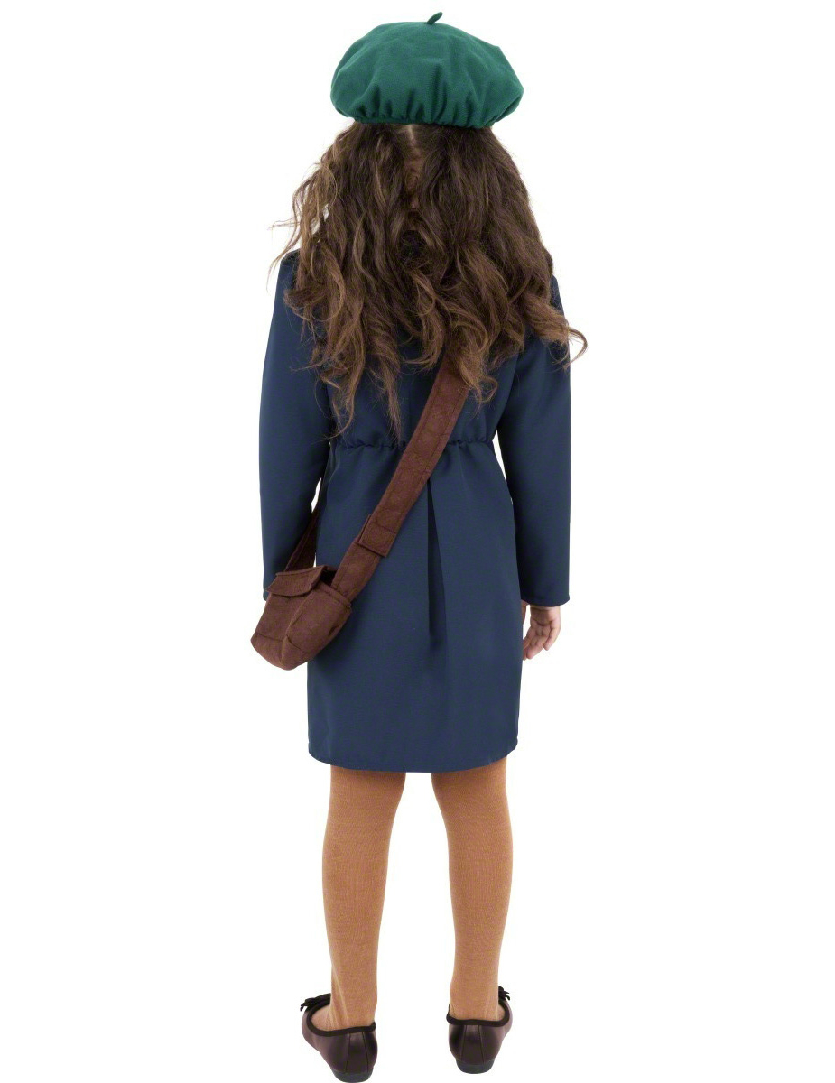 Deze schoolmeisje outfit uit de jaren 40 voor meisjes bevat een blauwe jurk, een groene baret en een kleine school tasje.