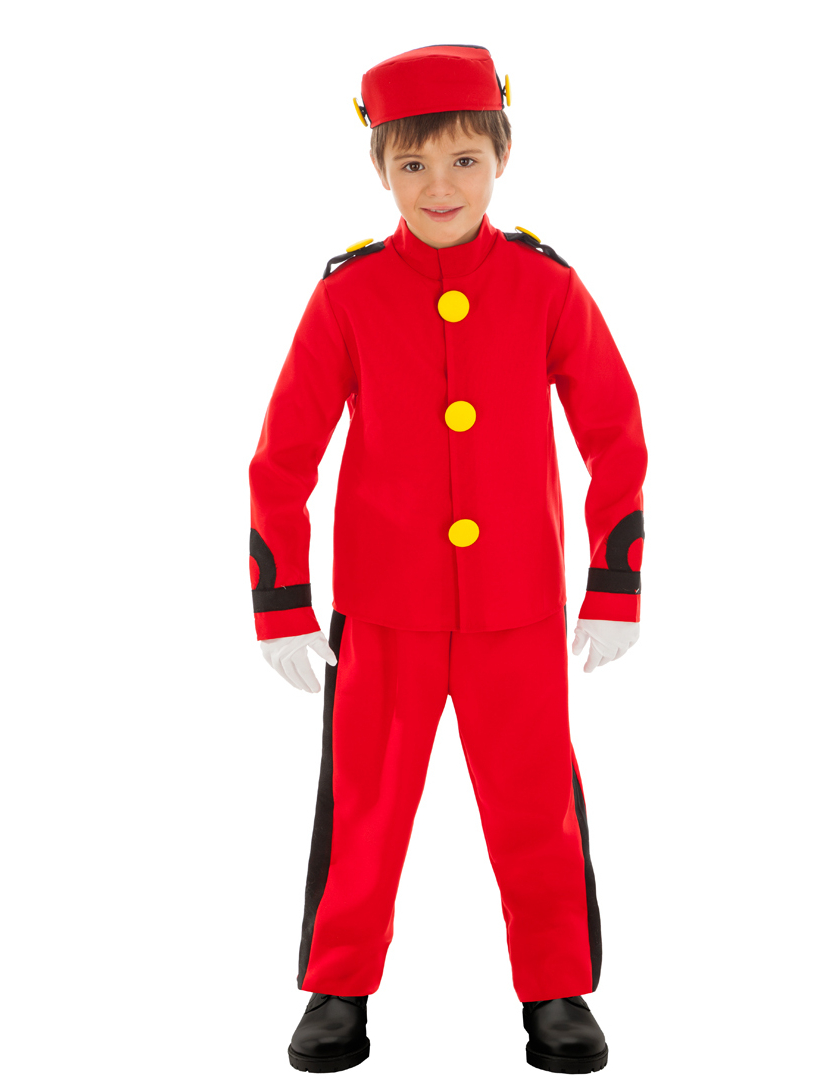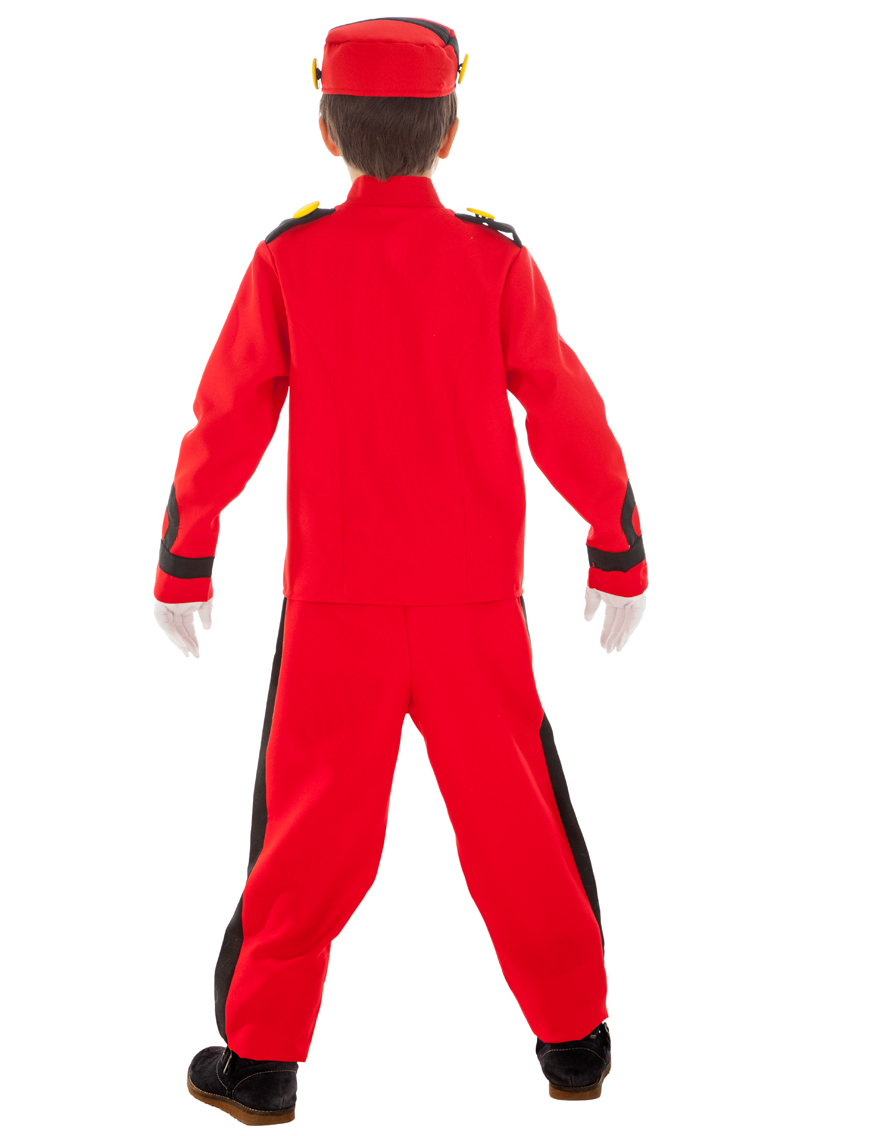De rode hoed heeft gele cirkels aan de zijkanten. Het jasje heeft lange mouwen en heeft zwarte stukken op de schouders en de onderarmen. Een strook zwart stof versiert de zijkanten van de broek.