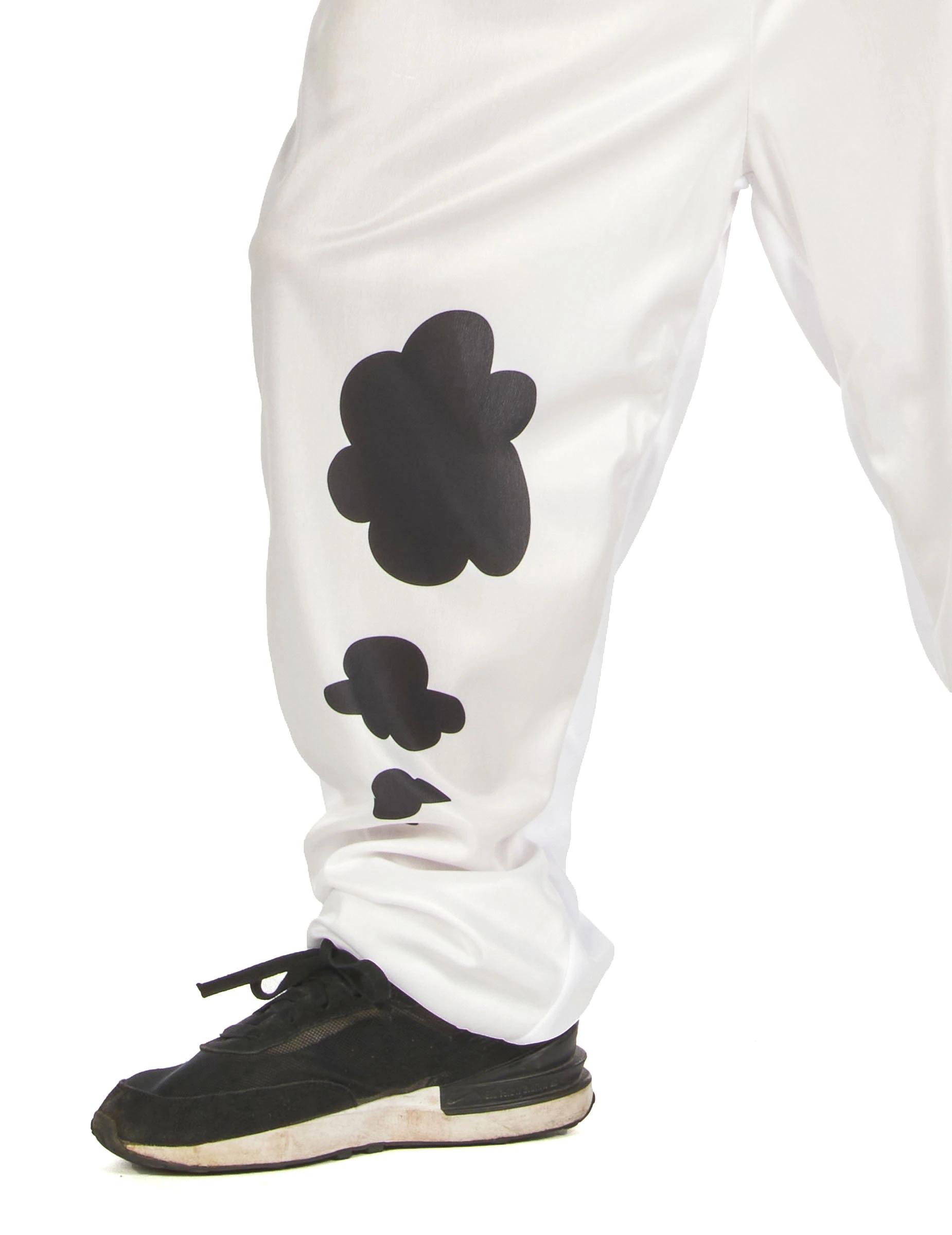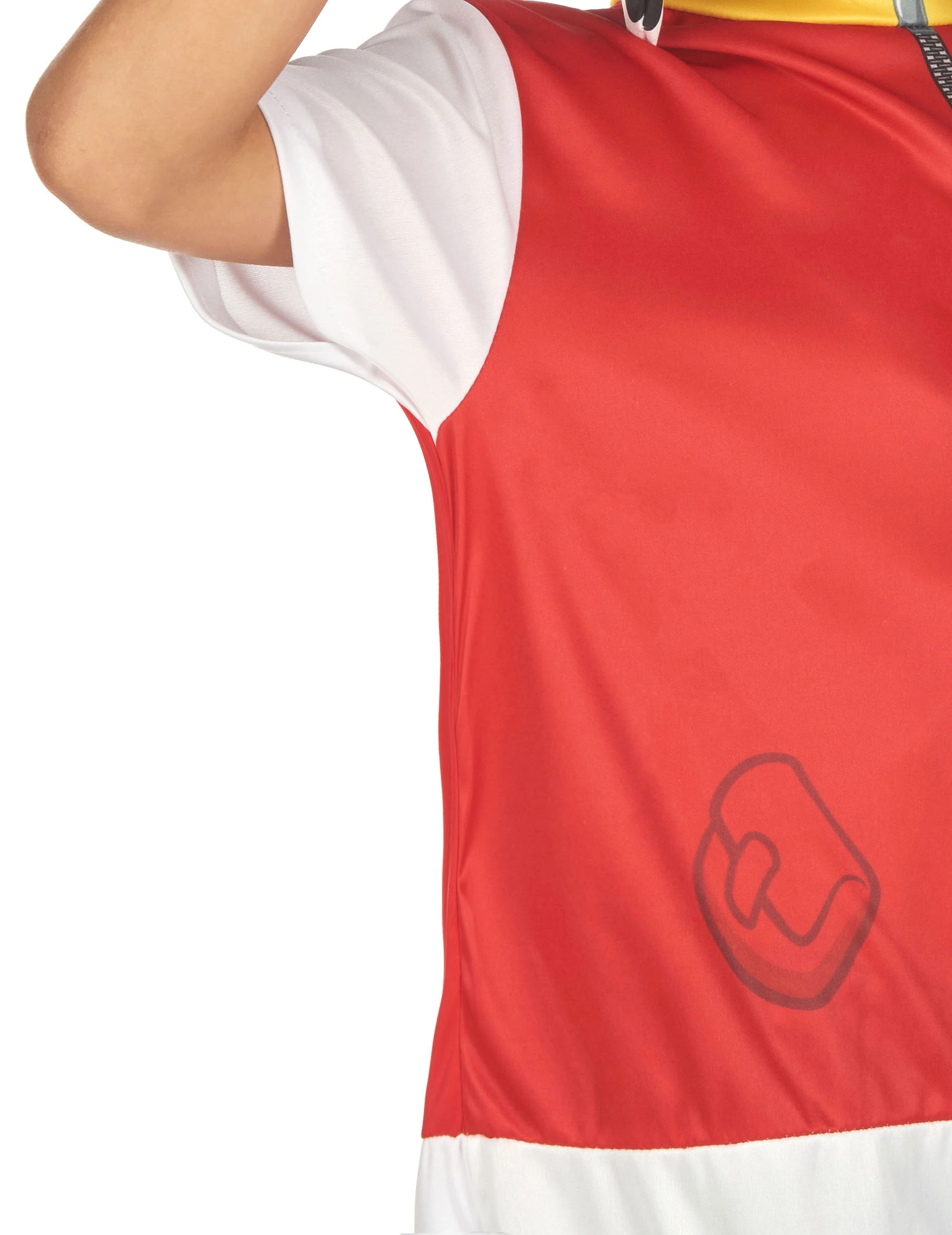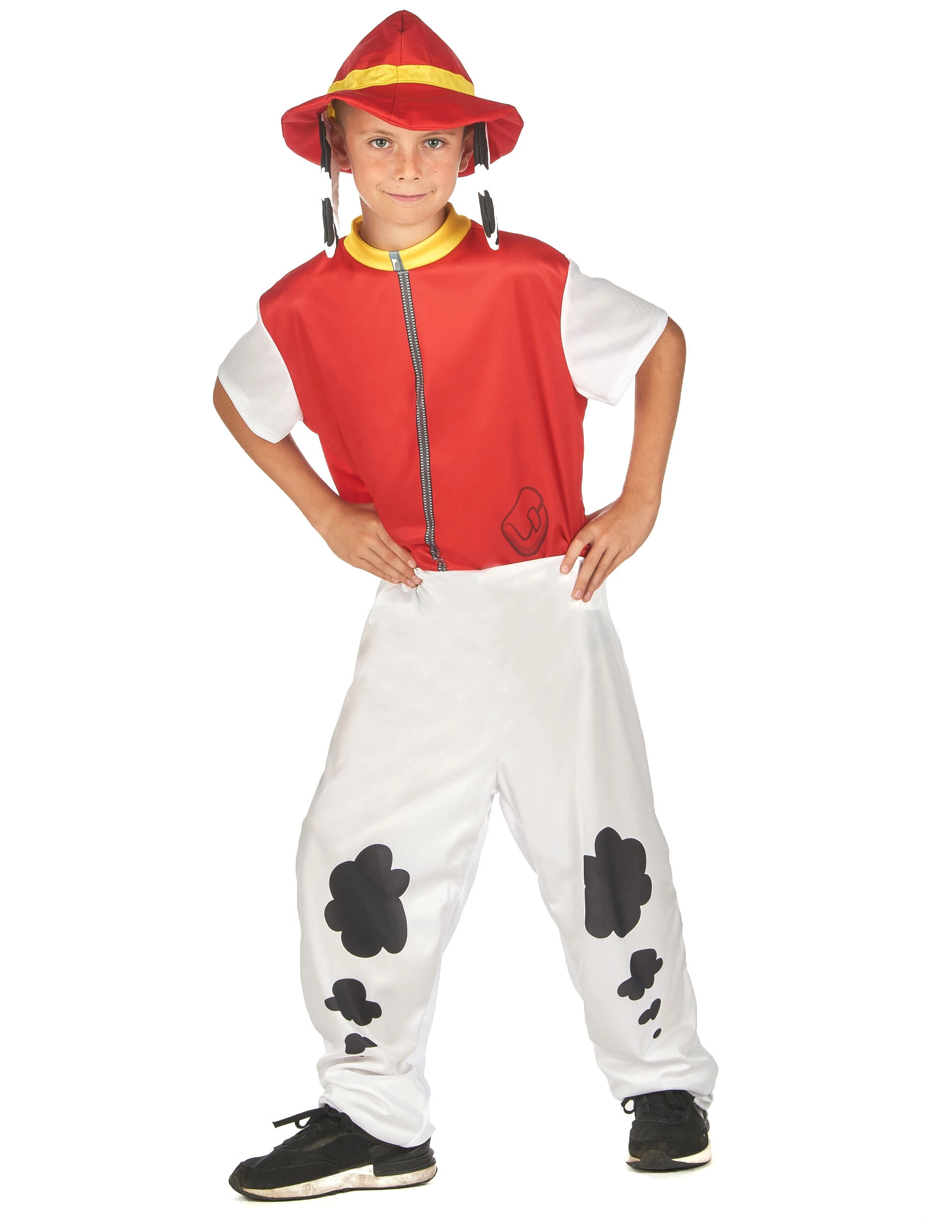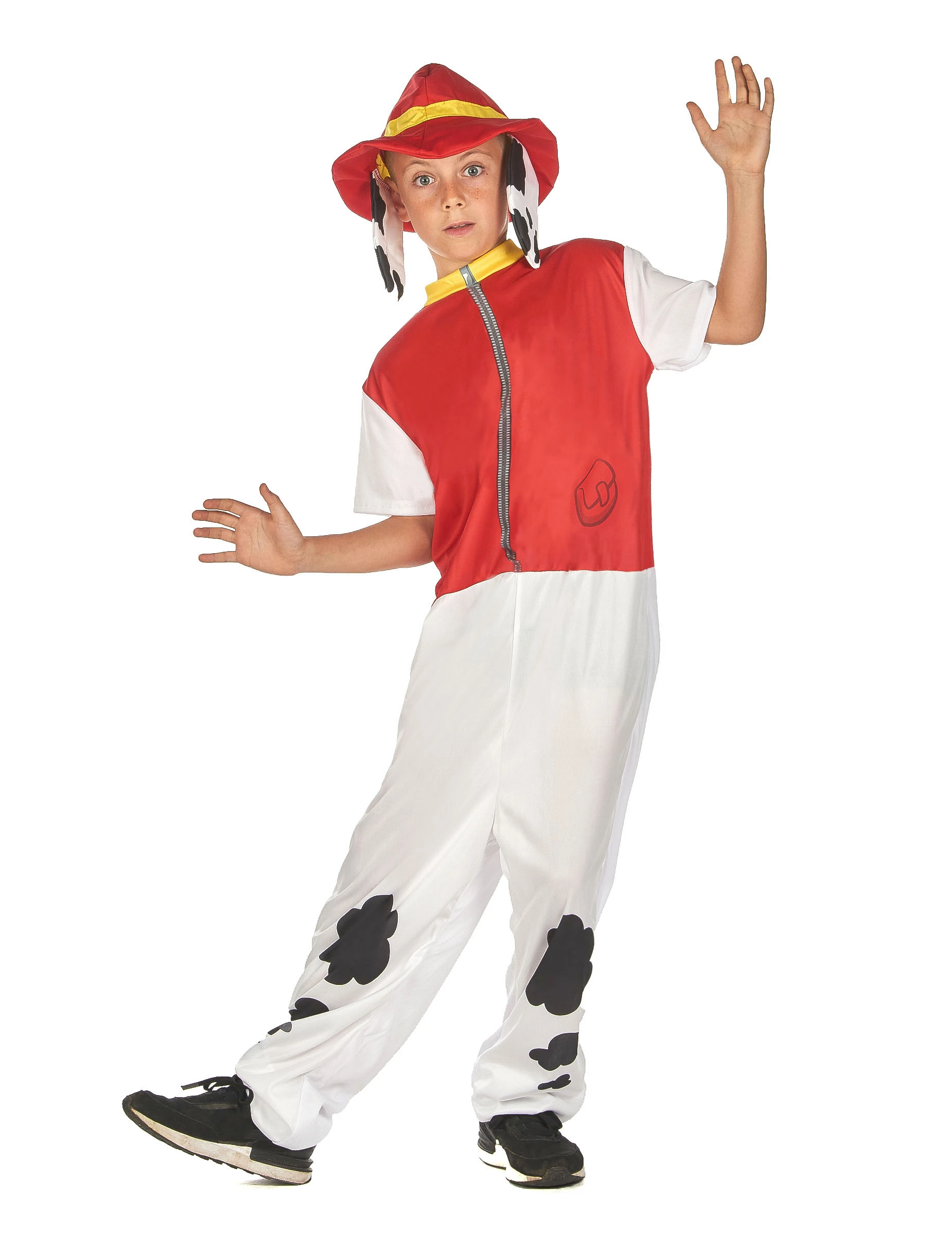 De jumpsuit met korte mouwen is rood vanaf de bovenkant van de taille en wit bij de benen vergezeld van zwarte vlekken en een valse staart.