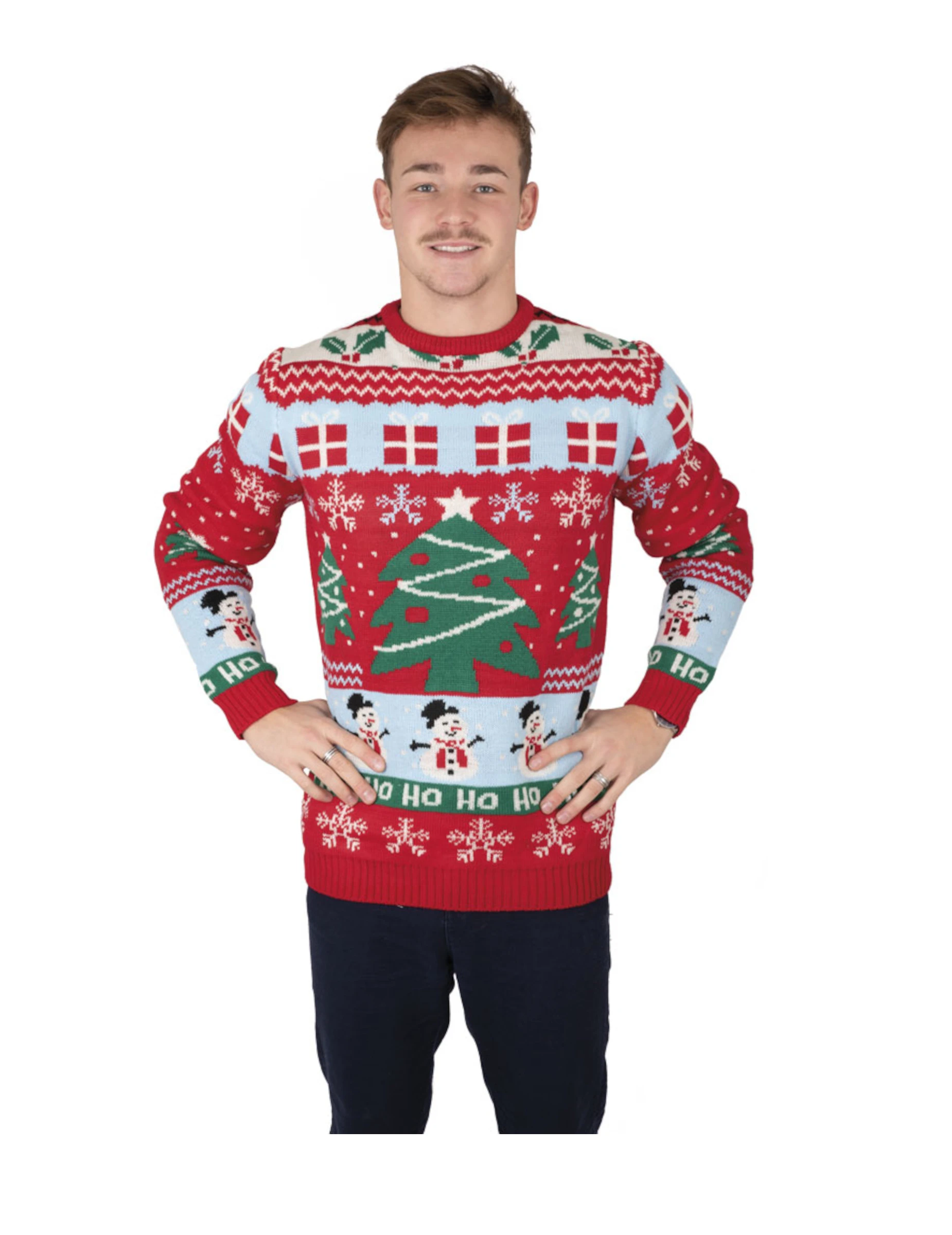 Op een rode achtergrond biedt deze trui een veelheid van bedrukte motieven (ruitjes, slingers, sneeuwvlokken, sneeuwpop enz.). In het midden staat een mooie kerstboom met versiering en ster!