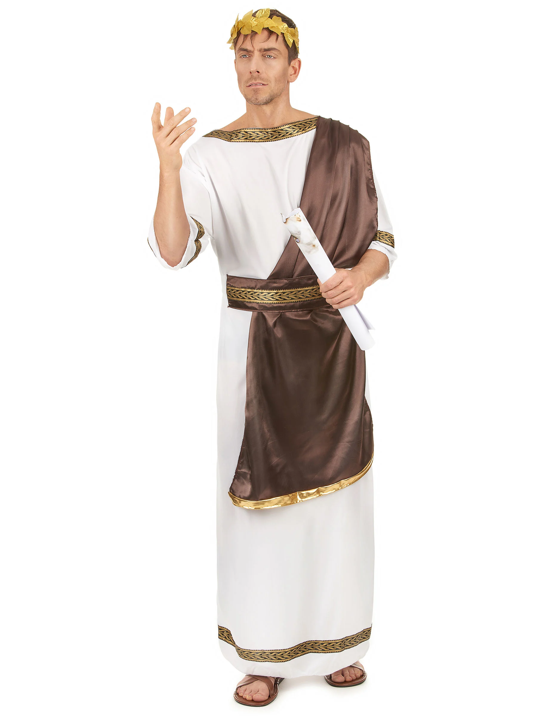 De Romeinse outfit is gemaakt van polyester. De lange witte tuniek is versierd met een satijnen bruine cape die aan de schouder is bevestigd. Ook is de kraag en de de uiteinden van de mouwen en de onderkant van de toga versierd met zwart-gouden banden. De witte plastic haarband is voorzien van goudkleurige bladeren en zorgt voor een perfecte aanvullig op deze carnavalskleding.