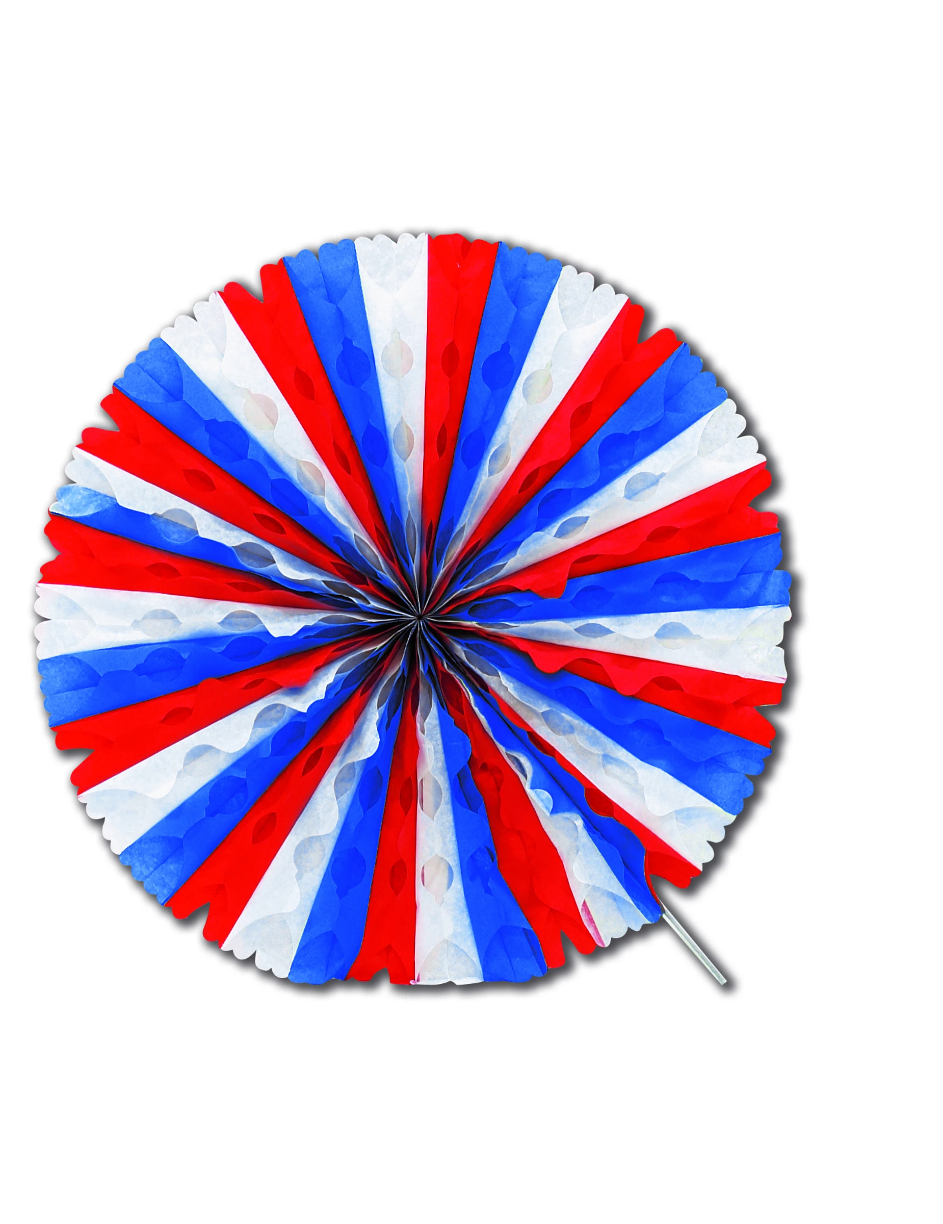 Deze ronde waaier heeft drie kleuren: rood, wit en blauw.