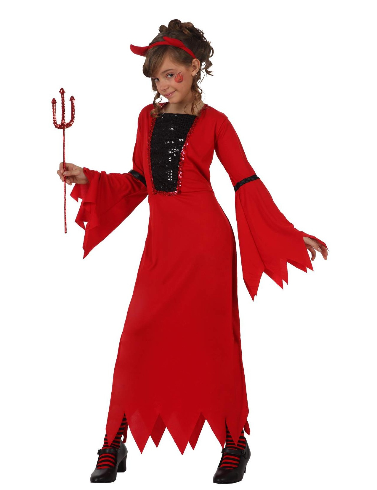 Dit duivelinkostuum voor kinderen bestaat uit een jurk en een hoofdband (schoenen, panty en vork niet inbegrepen). De rode jurk is lang. De uiteinden zijn gekarteld en er zitten lovertjesparels op het bovenstuk. De jurk is elastisch en past zich perfect aan het lichaam van uw kind aan. Een haarband met duivelshoorntjes maakt de outfit compleet. Deze outfit is perfect om van uw kind een echt duiveltje te maken bij Halloween.