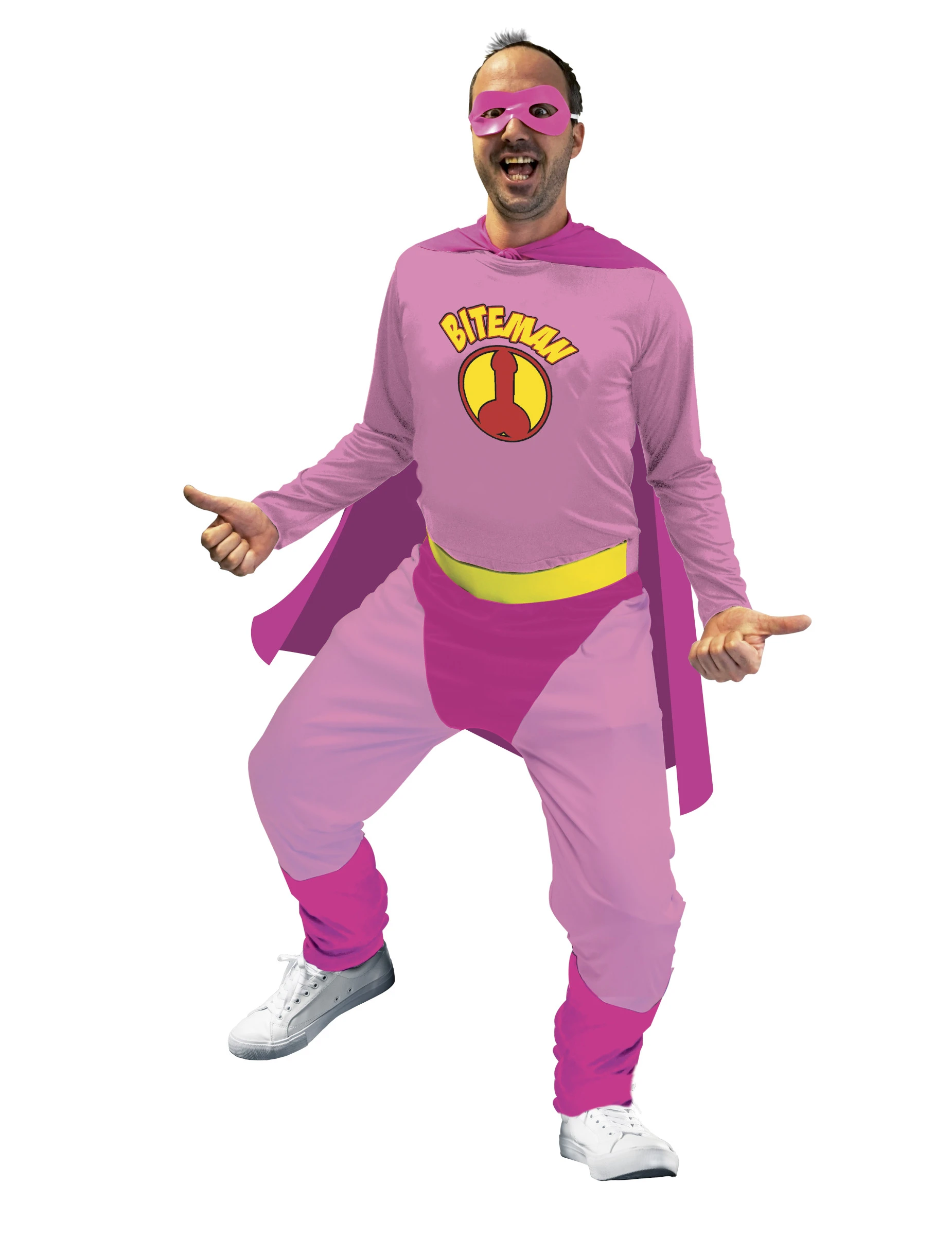 Dit Biteman kostuum is voor mannen. Het bestaat uit een pak, een masker, een riem en een cape.