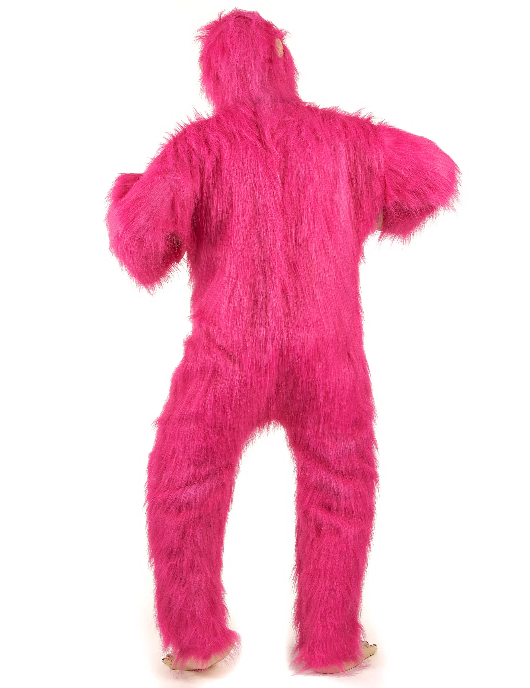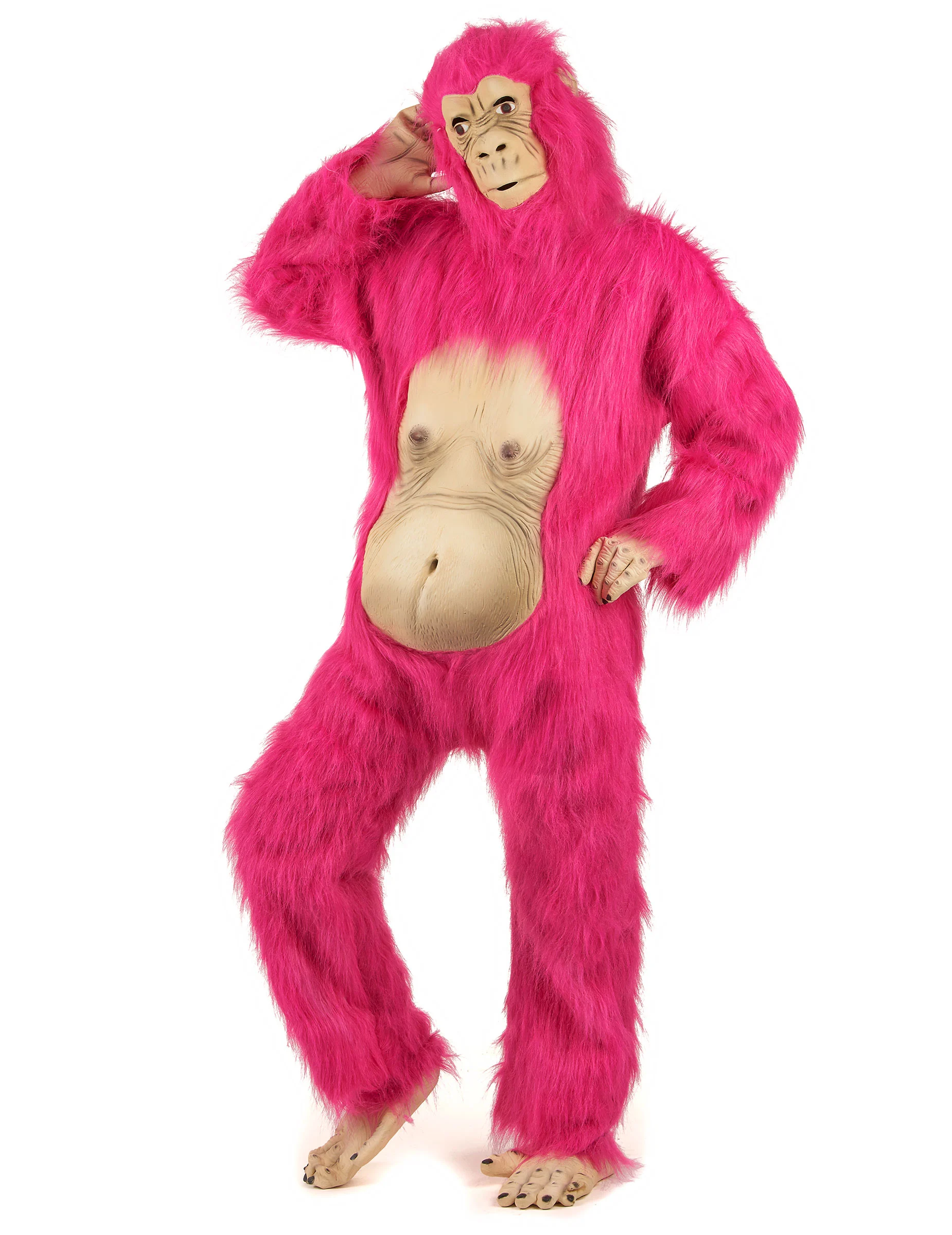 Deze roze gorilla outfit voor volwassenen bevat een pak, een kap, een paar handen en een paar poten.
