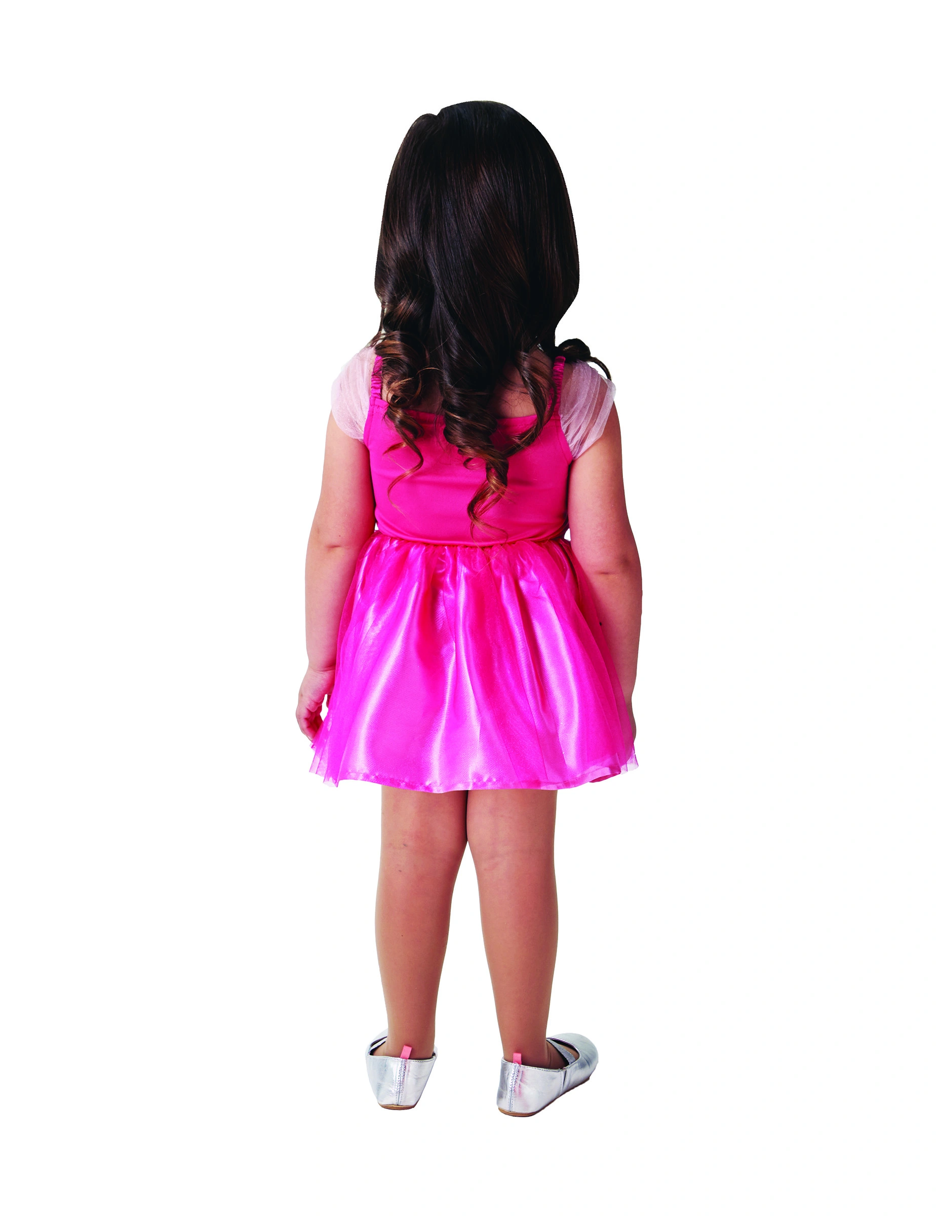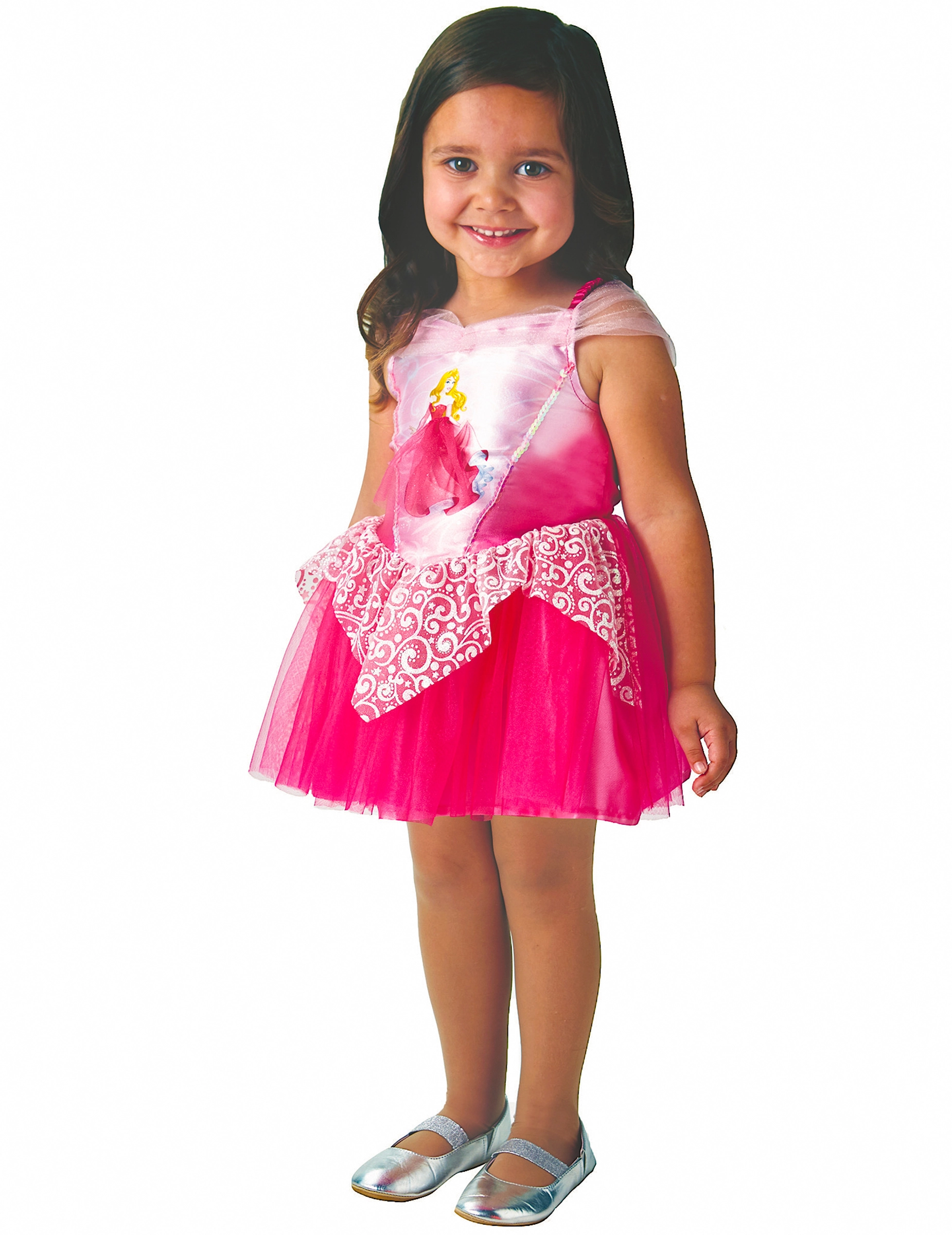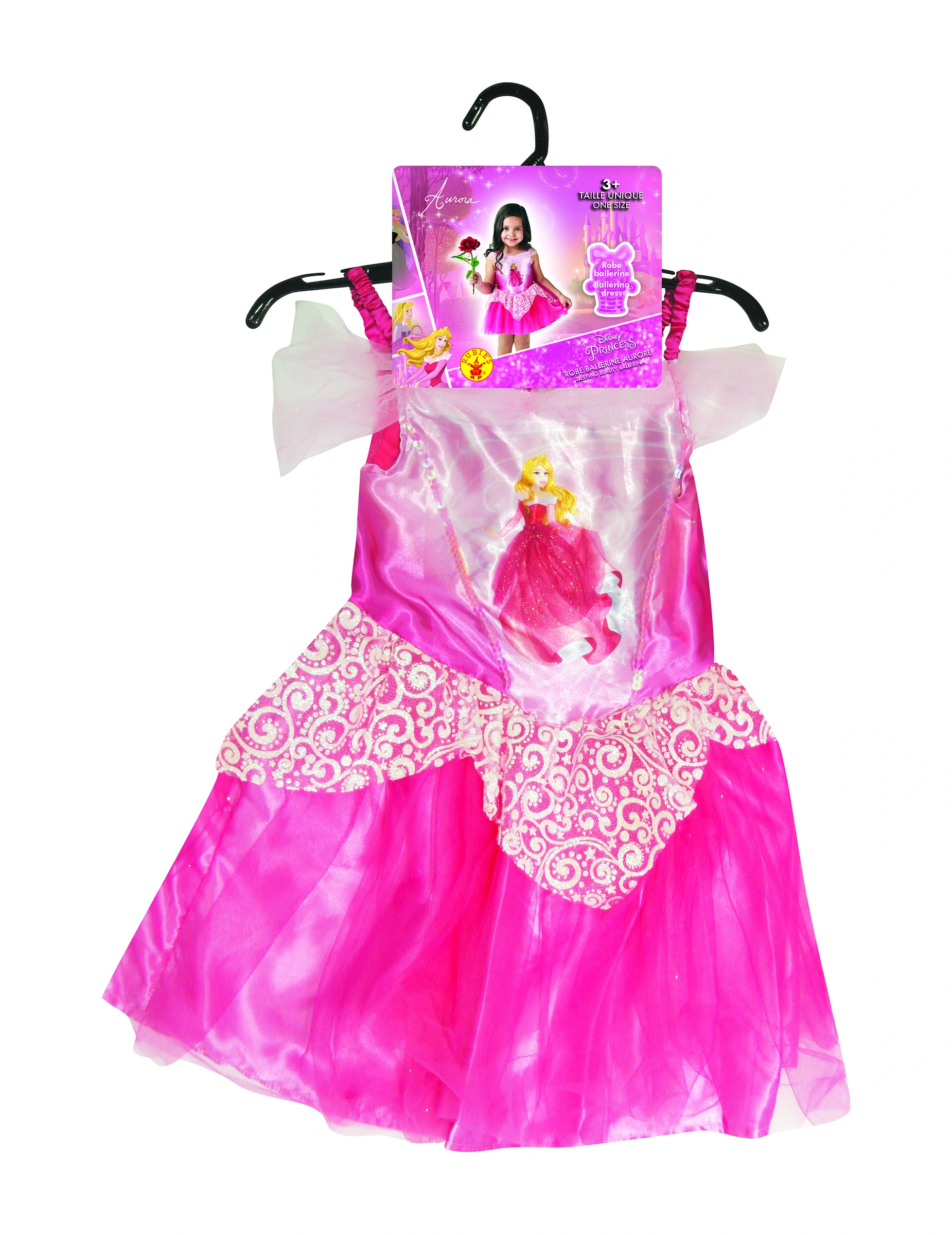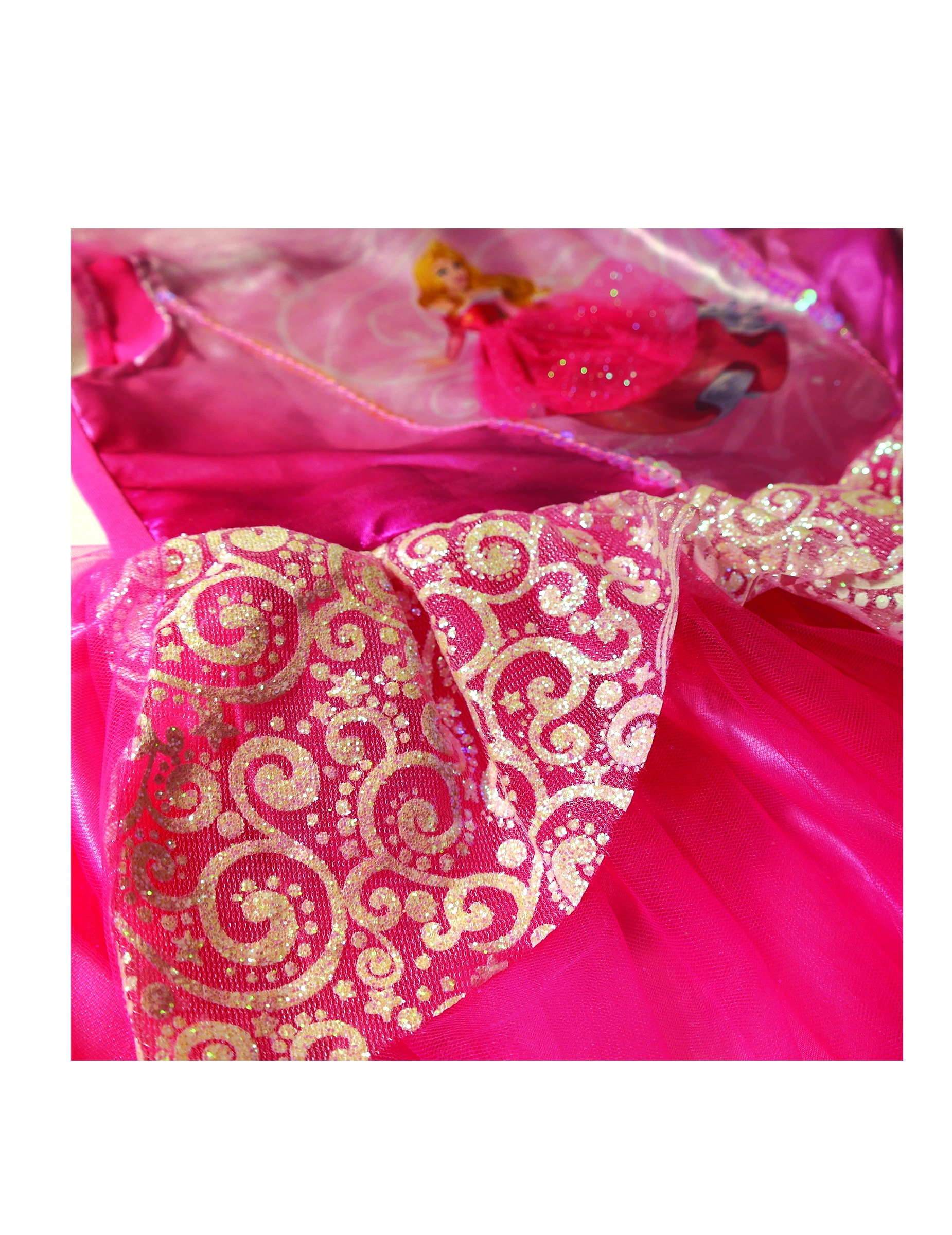 De jurk is roze en is gemaakt van satijnachtig stof met dunne elastische schouderbandjes. Prinses Aurora is afgebeeld op de borst, omringd met lovertjes. De onderkant is van roze tule en heeft een sluier met glitter patronen er overheen.