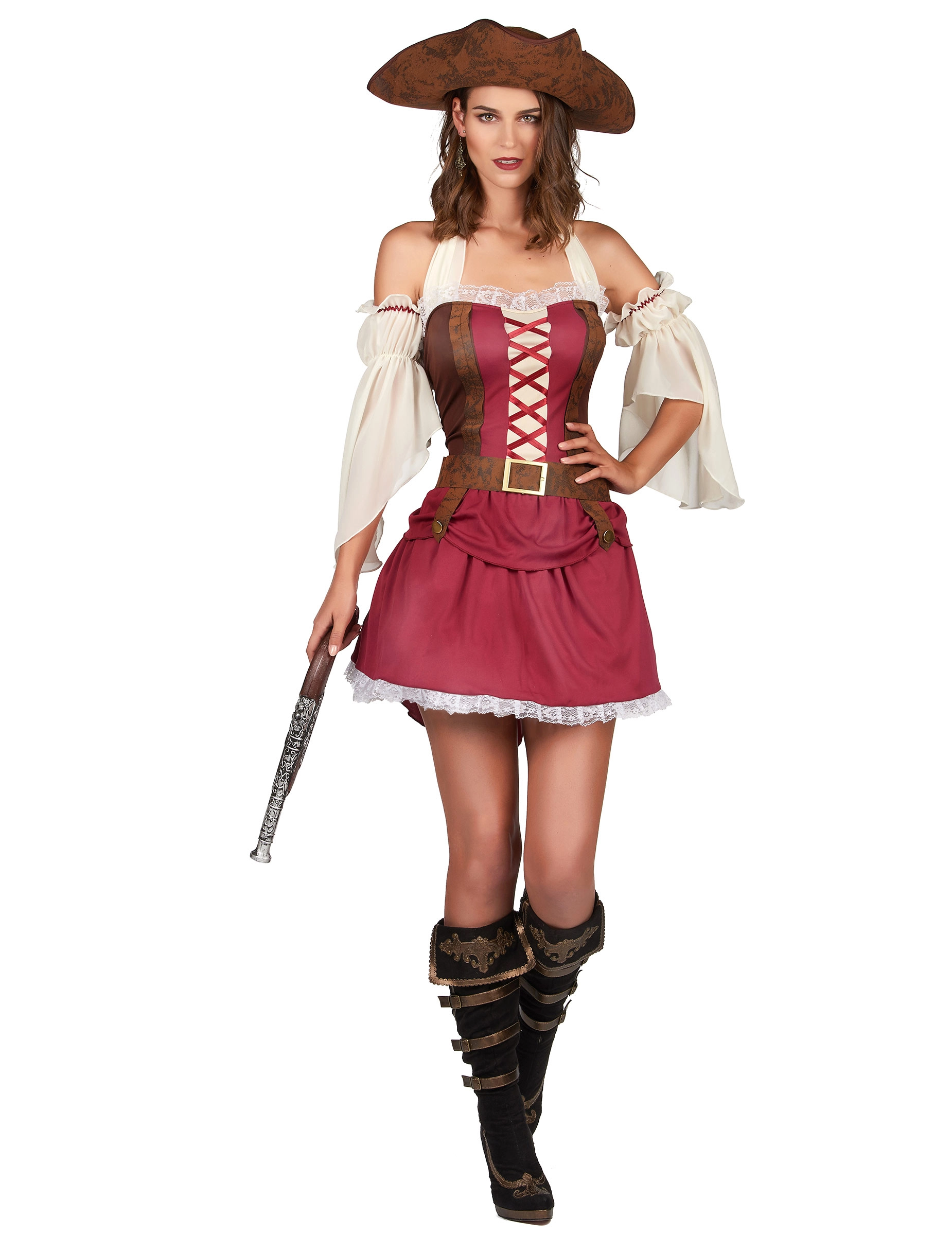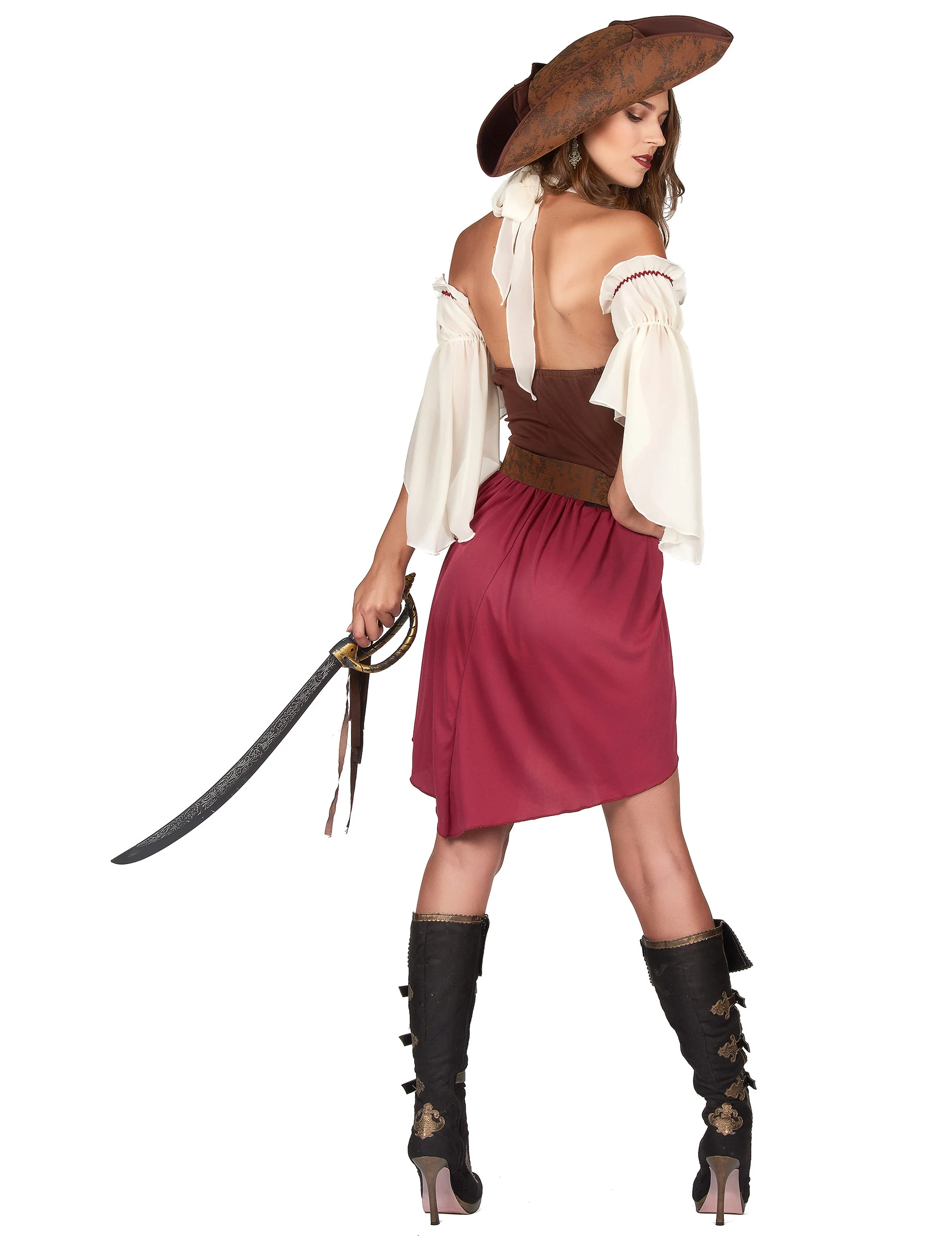 Dit piraten kostuum voor vrouwen bestaat uit een jurk, een rie, en een hoed (laarzen, armstukken en pistool niet inbegrepen).