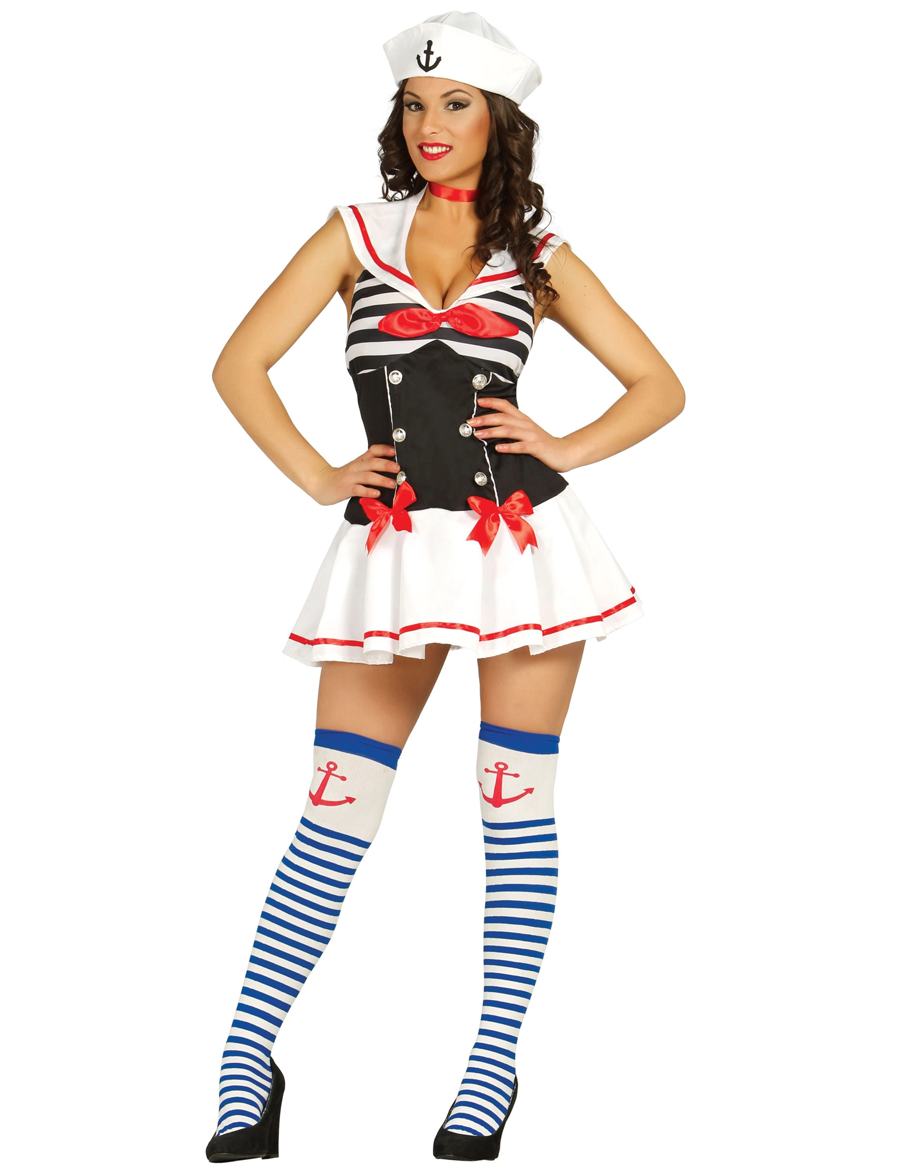 Deze matrozen outfit voor vrouwen bestaat uit een jurk en een hoed. (Halsketting, kousen en schoenen zijn niet inbegrepen).
