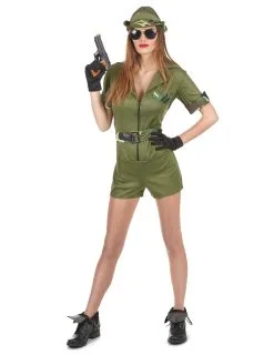 Dit militair kostuum voor vrouwen bestaat uit een 1-delig pak met riem en hoed (panty’s en schoenen niet inclusief).